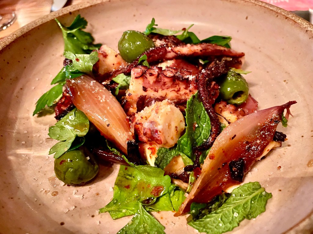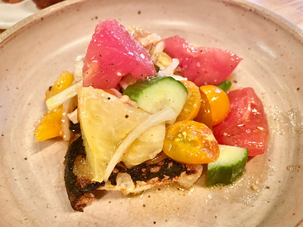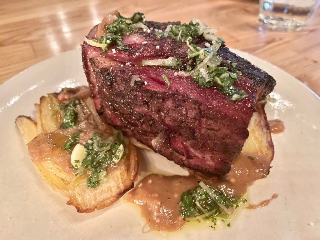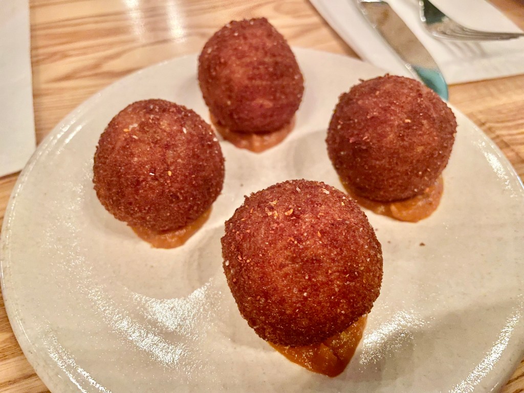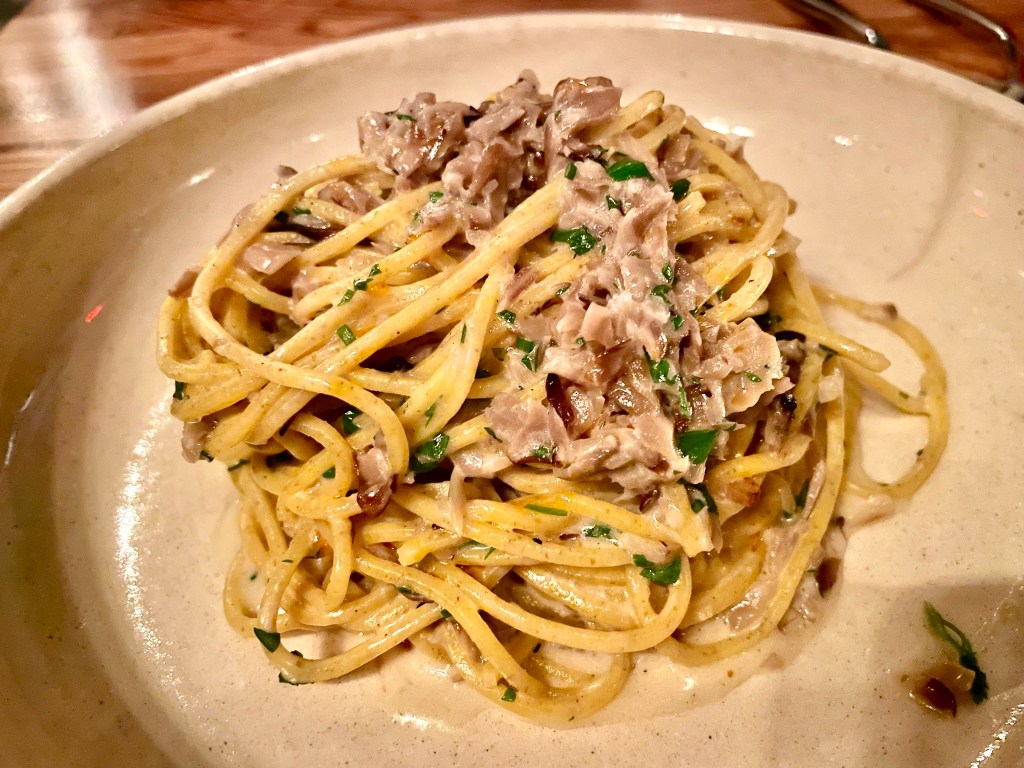Opened by the team behind the Mediterranean standout Tail Up Goat (which we also liked on our initial visit; will report back with a formal review at some point in the future) shortly before the pandemic began, Reveler’s Hour does not try too hard to please its diners. Looking at the menu only will not give a lasting impression that the kitchen is doing something extraordinary until you take that first bite of a soulful pasta dish. But before you go on your carb indulgence, I do suggest ordering a few appetizer dishes like the grilled octopus with red onions that was cooked more or less to perfect texture (which in our culinary journey has been surprisingly tricky to find in restaurants), or the eggplant parmesan arancini with smoked mozzarella and pepper that was quite hearty and delicious. On to the pasta. On our initial visit in the spring, the lumache pasta with spicy pork ragu we tried would be a standout pasta anywhere with its rich and homey feel, but the best dish of the night, to our great surprise, did not even use animal products as main ingredients. After taking the first bite of the spaghetti alla chitarra with wood roasted mushrooms and shallots, Jun’s eyes opened up widely and she exclaimed she had never tasted anything like this before. We’ve had pasta dishes using mushrooms before, but the earthy flavor that the kitchen showcased was simply exceptional.