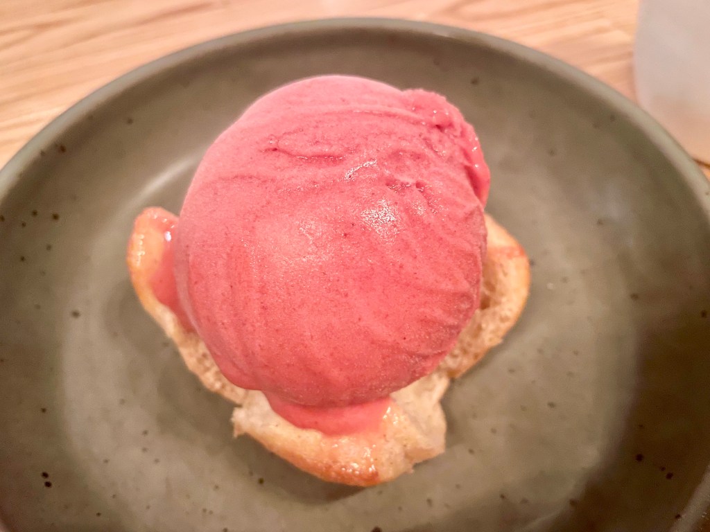 We were very sad to find out that the mushroom spaghetti was not available on our second visit with another couple, which featured very different pasta rosters appropriate for the summer season. The consistency of the texture of pasta shined again, whether it was the light corn cappellacci with shishito peppers, scallion, basil and garlic breadcrumbs or the more robust cacio e pepe with pecorino, black pepper and grilled zucchini. The pasta dish we ended up ordering twice (after not feeling quite full with the above-average entrée of pork belly main dish), though, was the wonderful bucatini with pork ragu, pecorino and fennel pollen breadcrumbs where the spicy flavor of the ragu worked beautifully with the al dente pasta noodle. If you have room for dessert after all the pastas, we enjoyed a delightful pecorino cake with citrus preserves that was not too sweet for our liking (available on our first visit) as well as scoops of a variety of ice creams and sorbets on top of brioche (on our second visit).
