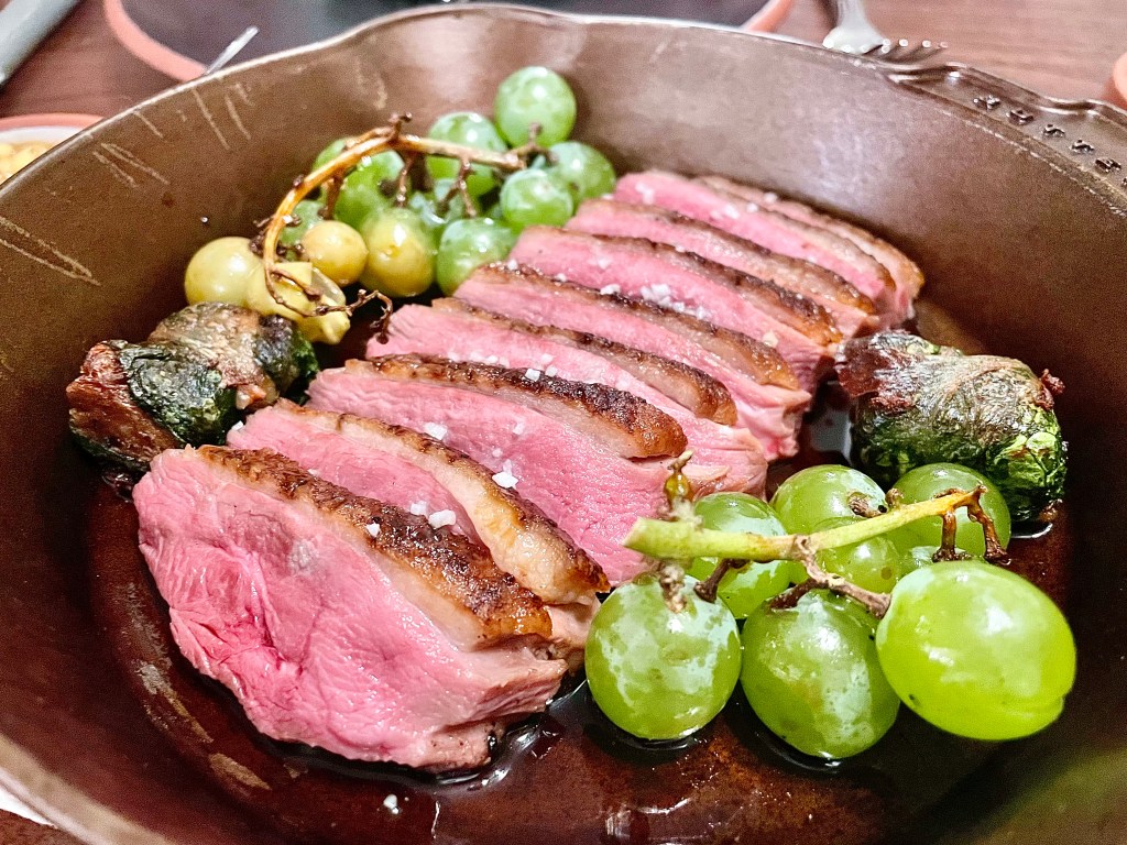 The best dish of the night for me was the pork loin with scallop; I don’t recall eating pork and scallop together but once I took a bite out of this beautifully plated dish, I had to wonder why more restaurants were not putting these two ingredients together. The textural “Surf and Turf” combination was quite remarkable, and the watermelon molasses underneath the pork was absolutely spot-on. Just like our last visit, the duck was the main savory dish at the restaurant. The aged Rohan duck cooked over the embers this time came in an elaborate feast-like format, consisting of the superbly charred breast with Jupiter grape glaze and fig BBQ sauce in the center and accompanied by crispy fried wing with fig BBQ sauce and mustard greens. Really, it’s hard to imagine a restaurant in DC that can pull off a duck dish as skillfully as The Dabney. After all the indulgence from the wonderful duck, we finished with a delightful dessert of carmen peppers and vanilla ice cream where the spicy kick of the peppers and the sweet flavor of the ice cream surprisingly worked harmoniously together, aided further by toasted meringue and shiso in the surrounding.