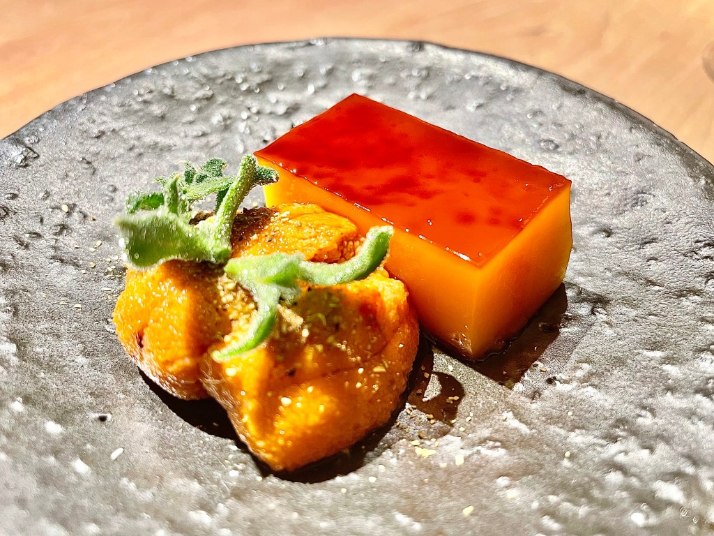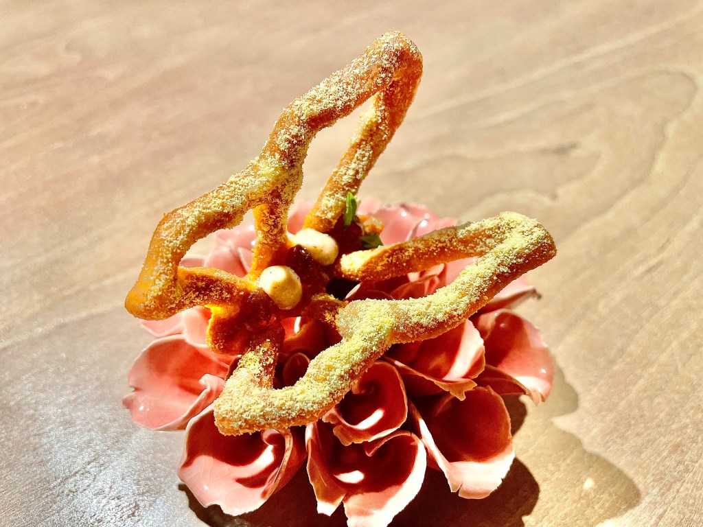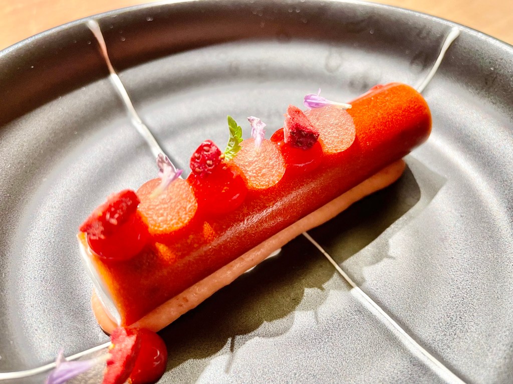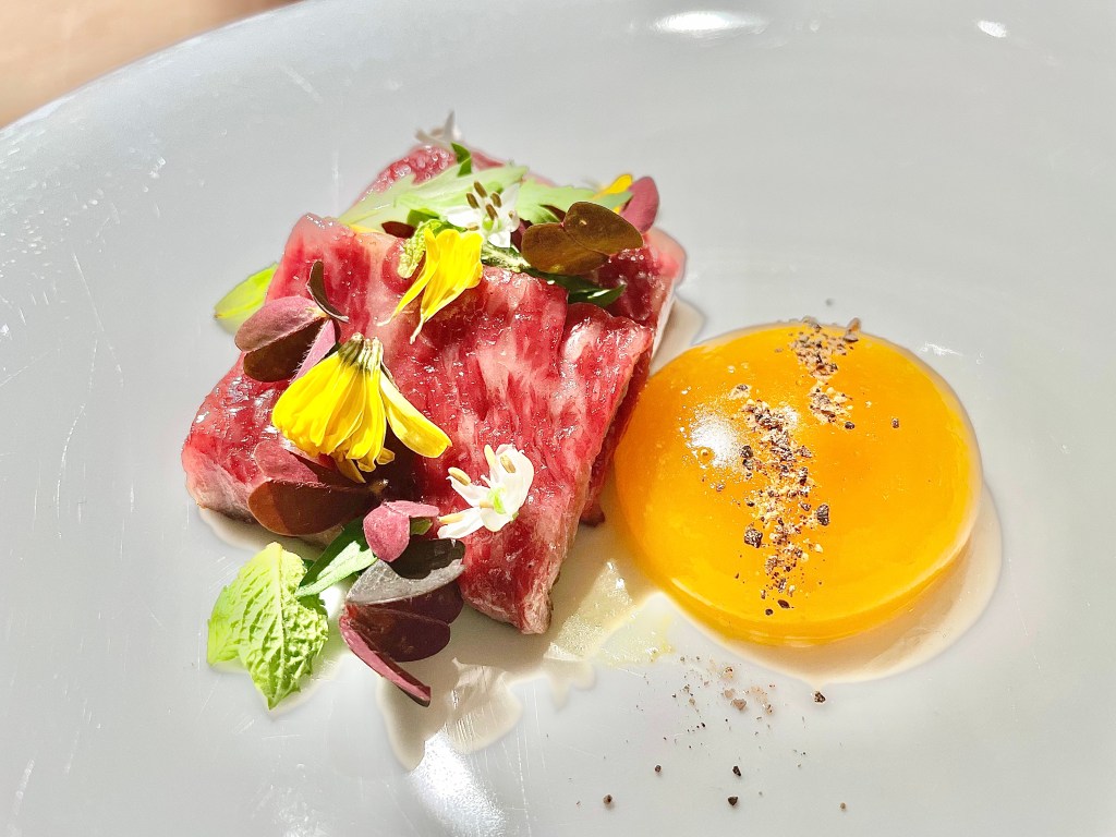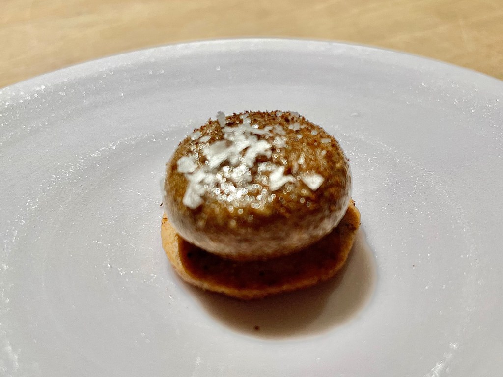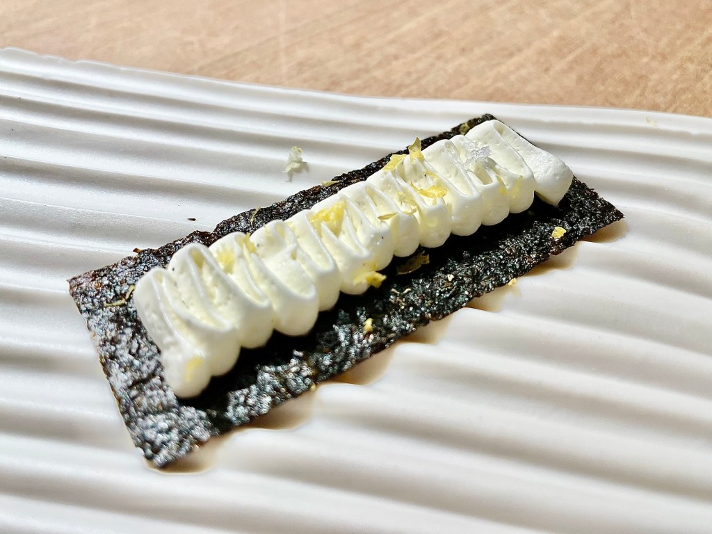 Some of the dishes, on the other hand, were slightly puzzling. While we understood the intent behind the kitchen to show a contrast in flavor between savory and sweet, the sweet side of the playful take on the toad in the hole toast with egg yolk on top was a bit off with the caviar next to it. Same issue with the next dish where the Tocino de Cielo (think a traditional Spanish flan) rather overpowered the delicate sea urchin that came with it. Other dishes like monkfish and wagyu aburi (think lightly torched wagyu sushi) were solid but not particularly memorable. The one unexpected surprise was a dish called “frozen salad 3.0,” a frosty cucumber salad that worked as a nice transition dish between the savory and dessert courses. On the dessert side, we encountered a nori seaweed wrap (another Japanese inspiration), and then had a very delicious strawberry milk dish (milk sorbet inside a strawberry tuile). After a few other smaller bites, our meal was complete. It was a fairly lengthy affair but given the portion of each dish, we didn’t feel too overwhelmed with all the food.