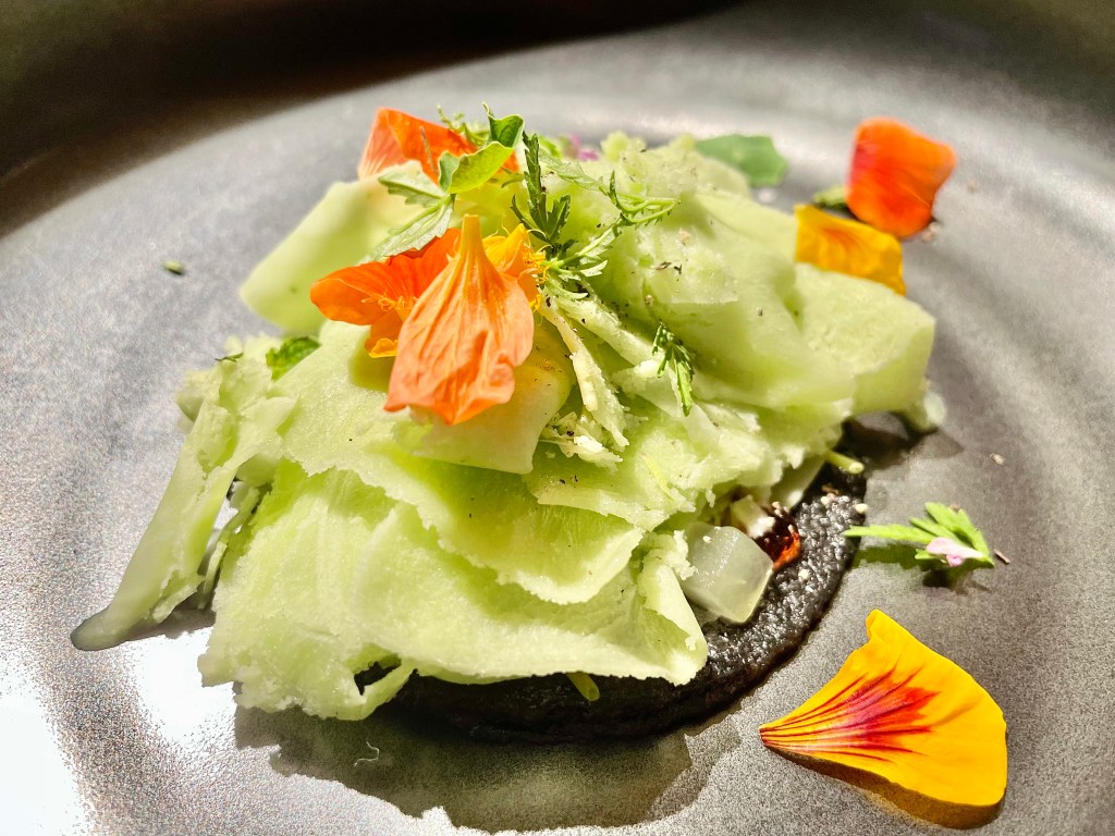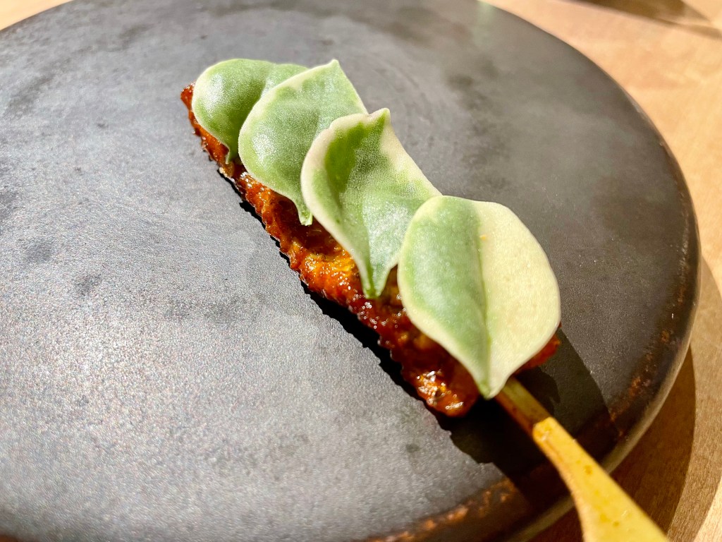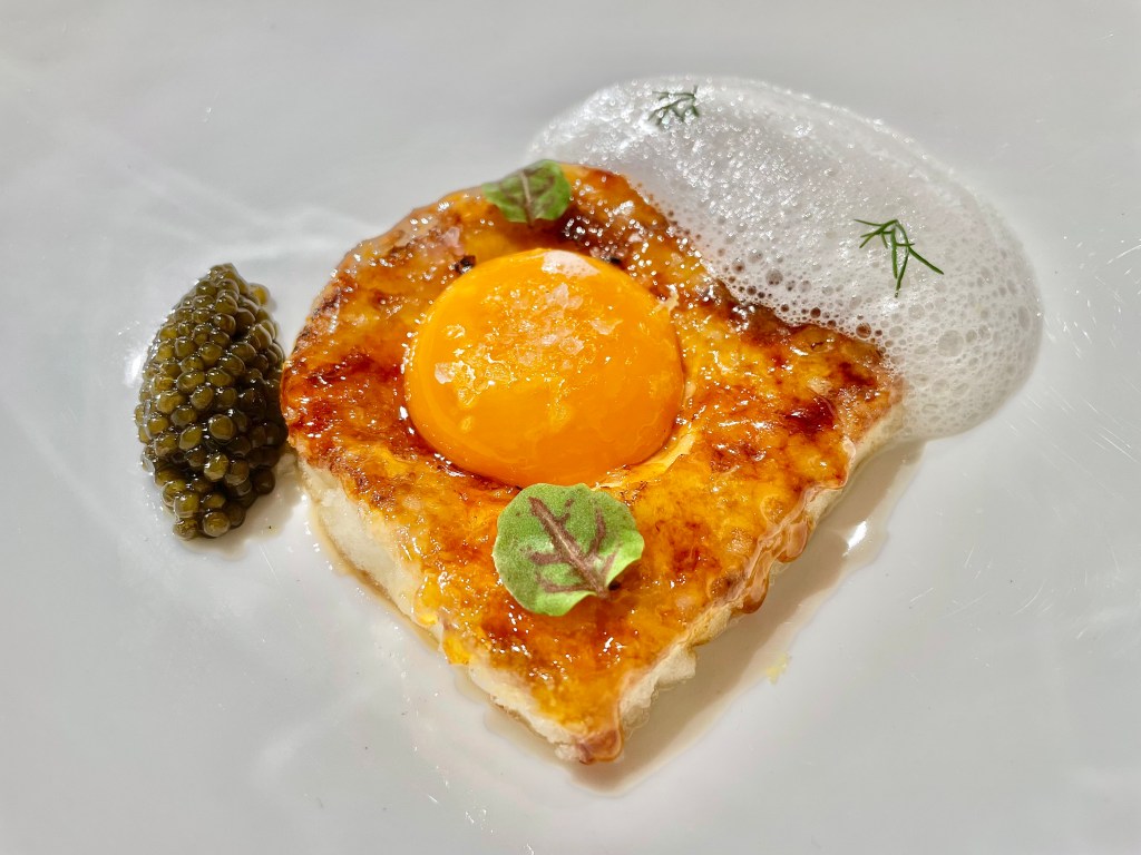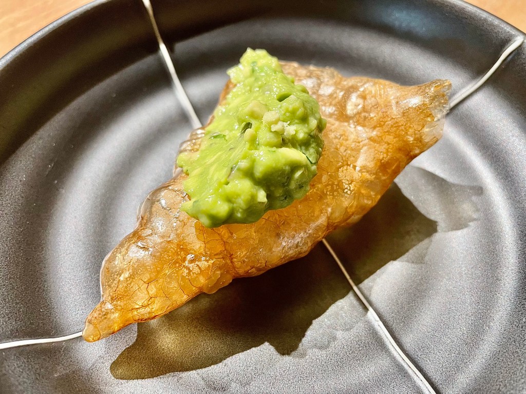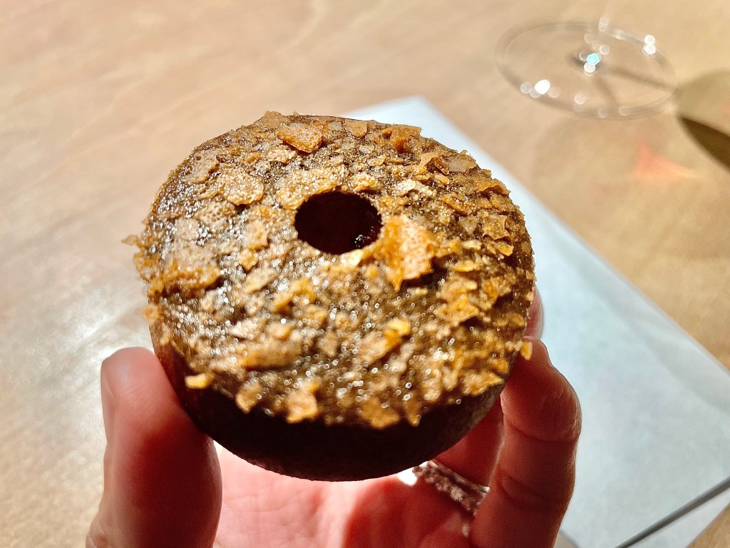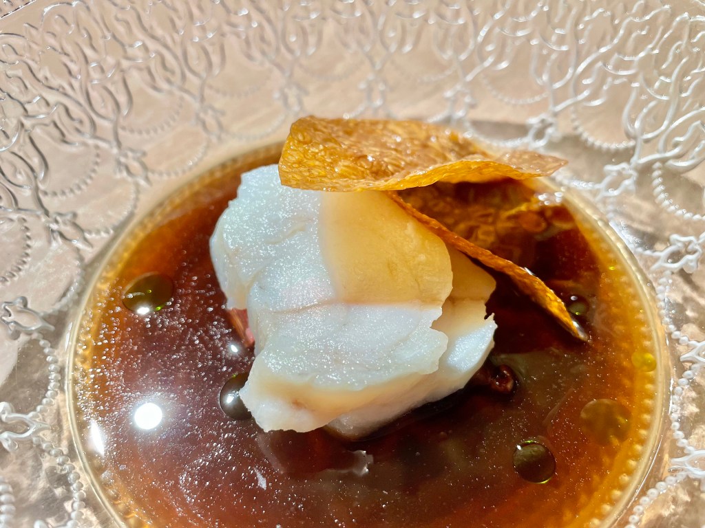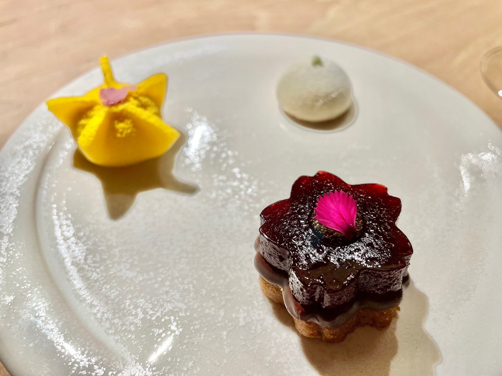 Some of the dishes, on the other hand, were slightly puzzling. While we understood the intent behind the kitchen to show a contrast in flavor between savory and sweet, the sweet side of the playful take on the toad in the hole toast with egg yolk on top was a bit off with the caviar next to it. Same issue with the next dish where the Tocino de Cielo (think a traditional Spanish flan) rather overpowered the delicate sea urchin that came with it. Other dishes like monkfish and wagyu aburi (think lightly torched wagyu sushi) were solid but not particularly memorable. The one unexpected surprise was a dish called “frozen salad 3.0,” a frosty cucumber salad that worked as a nice transition dish between the savory and dessert courses. On the dessert side, we encountered a nori seaweed wrap (another Japanese inspiration), and then had a very delicious strawberry milk dish (milk sorbet inside a strawberry tuile). After a few other smaller bites, our meal was complete. It was a fairly lengthy affair but given the portion of each dish, we didn’t feel too overwhelmed with all the food.
