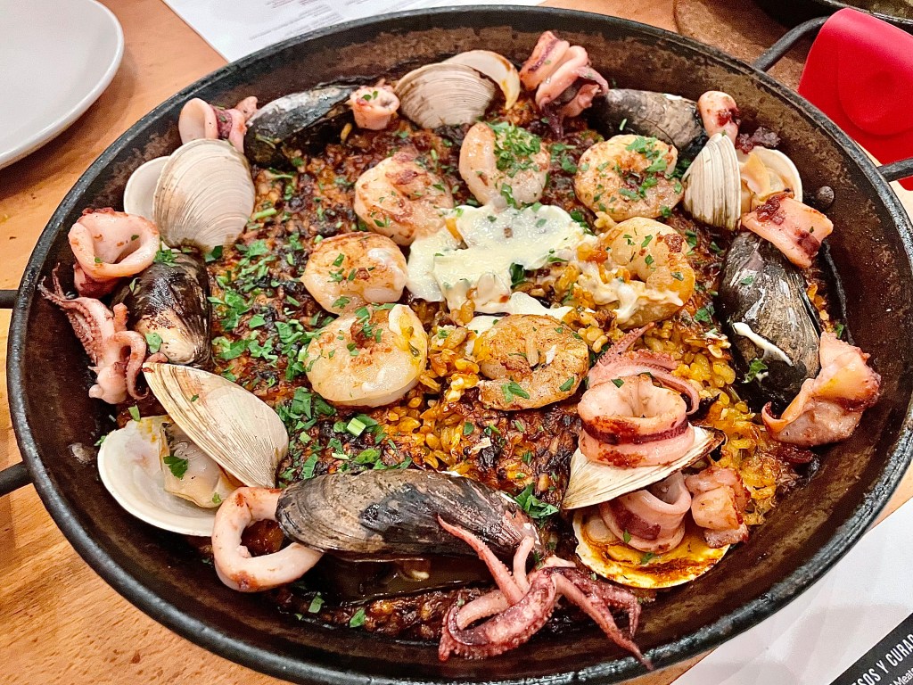 We tried two paellas during our visits, and by far the best one was the negra one with squid ink sauce, saffron aioli and calamari. The contrast between the crunchy bomba race and the lightly grilled calamari is a model for how a paella dish should be made, and Jun and I gladly finished it without looking back. While the mariscos paella with a variety of seafood ingredients was also solid, it didn’t have the same delightful socarrat that the negra dish showed. I will say one thing that is very important if you want to have a successful meal at El Mercat. DO NOT SKIP THE DESSERT! While Jun and I had had some really outstanding cheesecakes before, the Basque burnt cheesecake from the restaurant definitely stands on its own with fabulous texture. The stuffed churros (with either dulce de leche or Nutella inside) are also not to be missed as a decadent treat, and the crema catalana is a great option for someone who is a crème brulee fan.