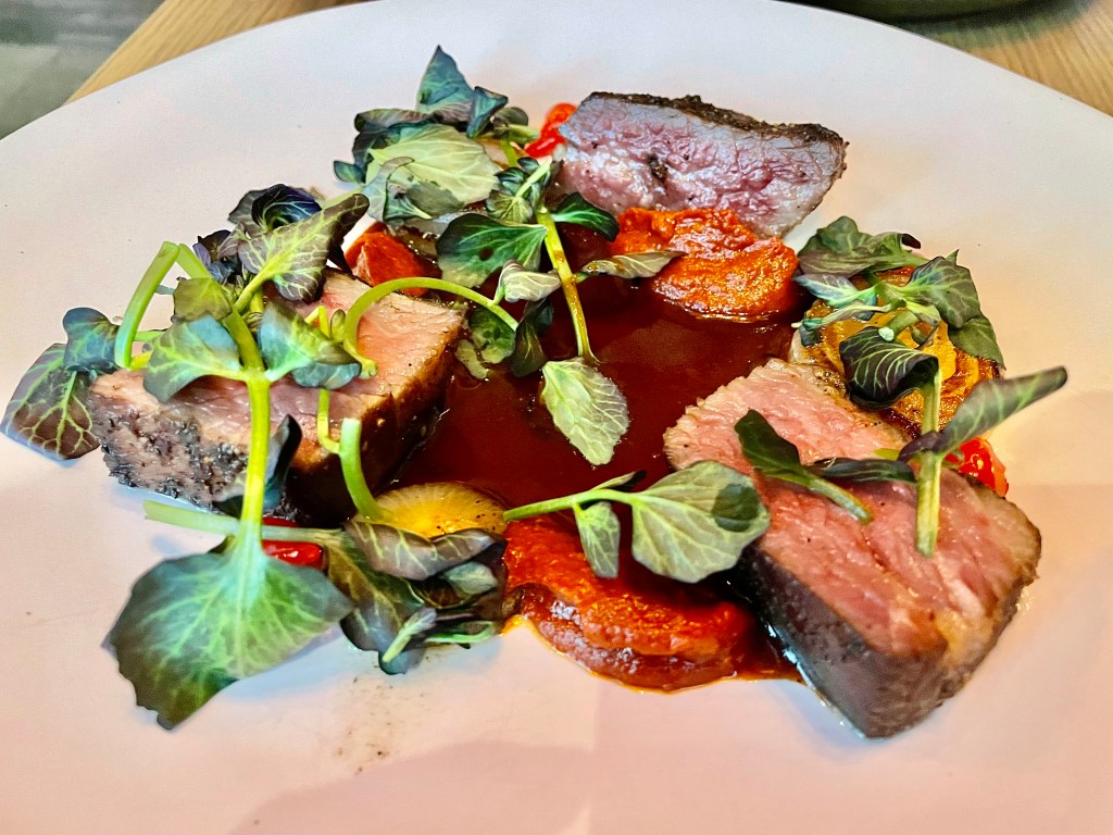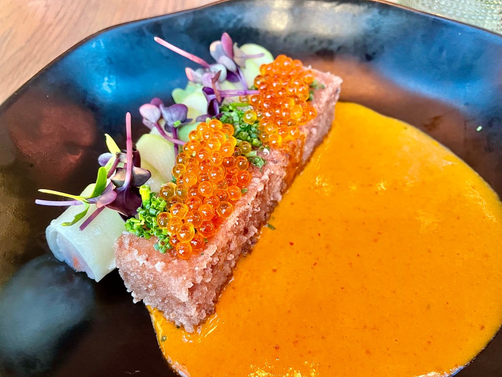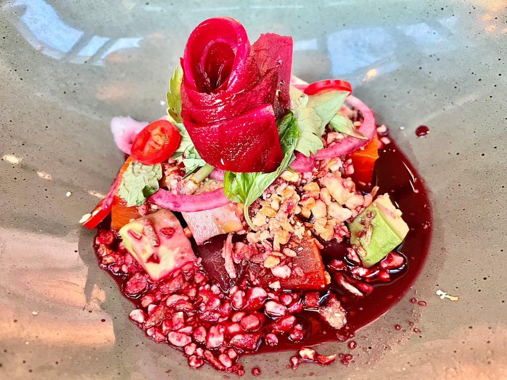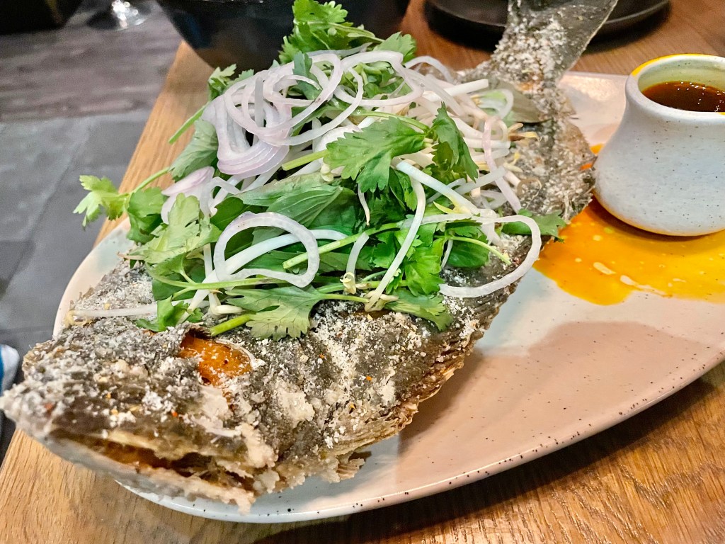 If you are familiar with Vietnamese food lie a bowl of pho, spring rolls or banh mi sandwich, you wouldn’t immediately recognize the dishes at Moon Rabbit as originated from the country’s culinary tradition. Most of the dishes on the menu had the names of the Vietnamese dishes that inspired them. Take, for instance, a dish of bluefin tuna, beets and crushed peanuts whose display resembled that of tiet canh vit, a type of raw blood pudding (I don’t believe there was any raw blood here though). We both enjoyed the textural combination of the tuna and beets that made for a very solid appetizer. Our assessment of another dish, this time inspired by sui mai dumpling, was a bit more mixed. I thought this mix of squash, shrimp stuffing and grits made of fried unicorn fish offered interesting flavor while Jun was a bit put off by the texture of the grits. Bo luc lac is a popular sauteed beef dish of Vietnam, and the version at Moon Rabbit with wagyu tri-tip accompanied by black pepper jus, watercress and tomato harissa was solid, too. The best dish of the night belonged to a gigantic whole fried flounder. Curiously named canh chua (a type of sweet and sour soup) even though there was no bowl of soup (only a sweet and sour broth to add to the flounder), it was wonderfully fried, giving nice contrast with the soft inside, and Jun gladly deboned the entire fish. We were running of room in our stomach by the time we finished the flounder so unfortunately had to skip dessert.