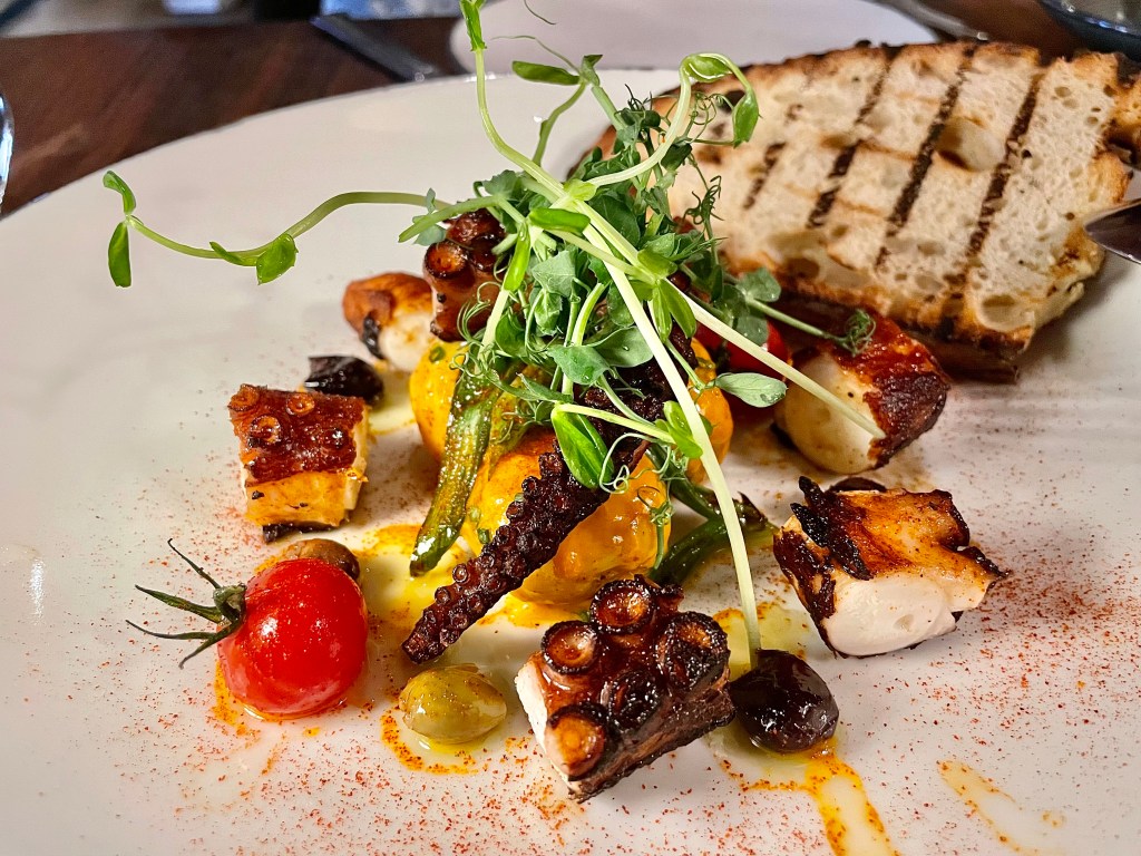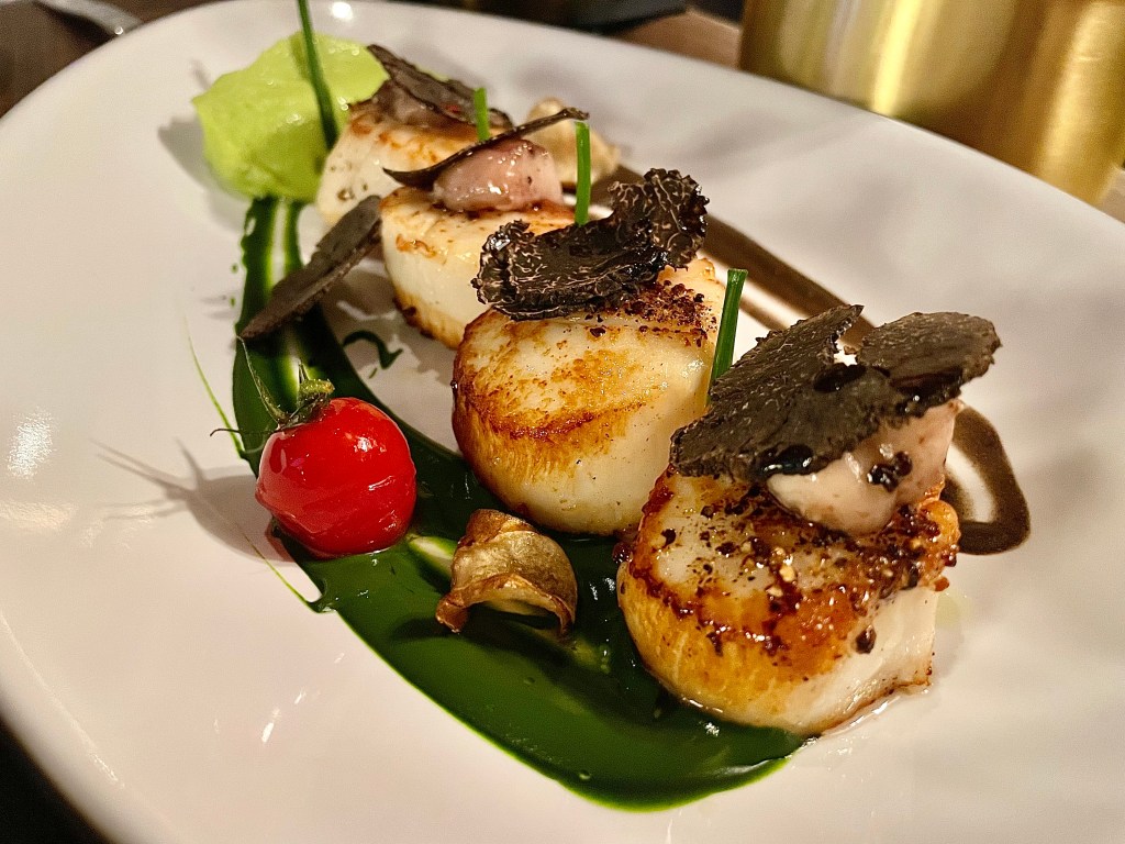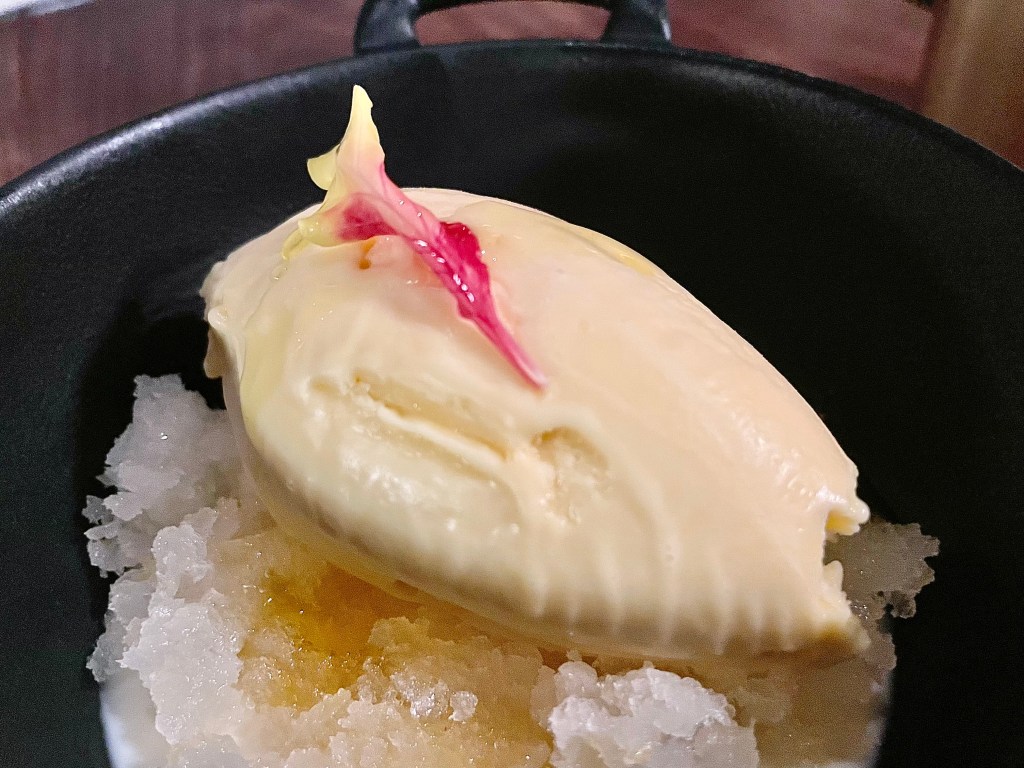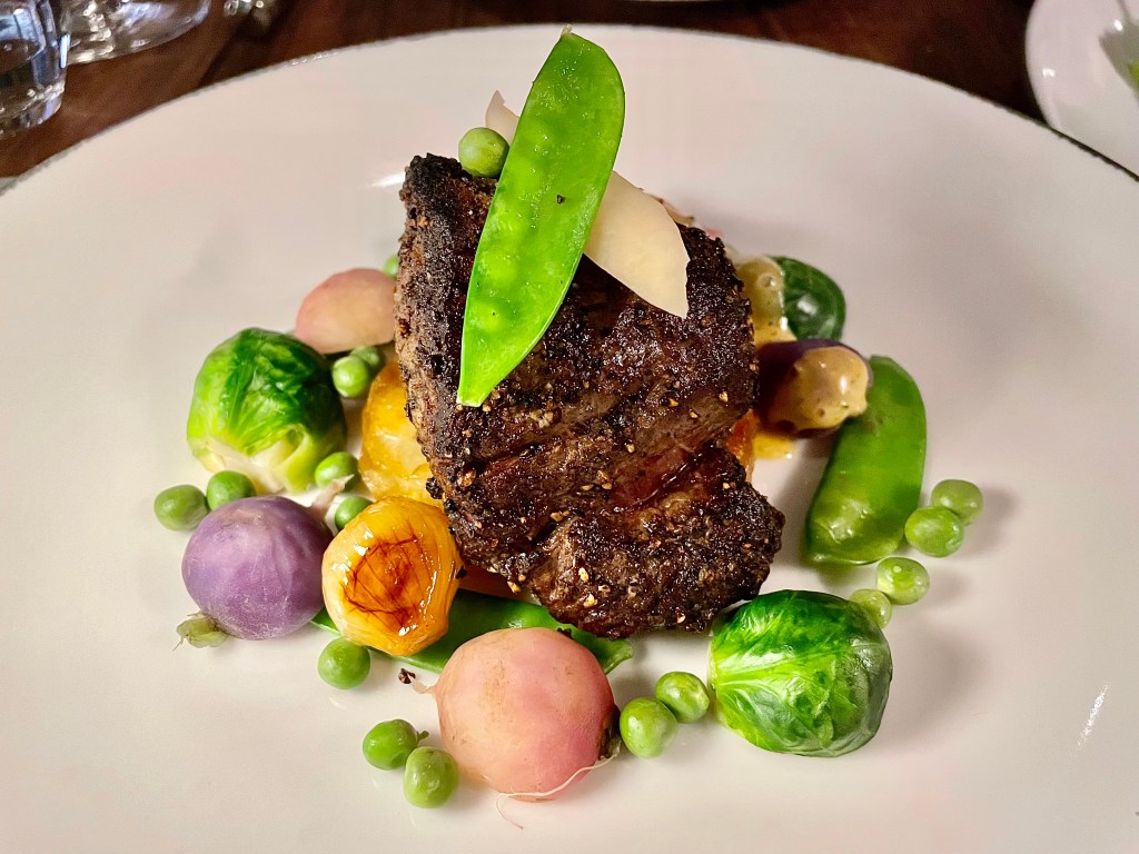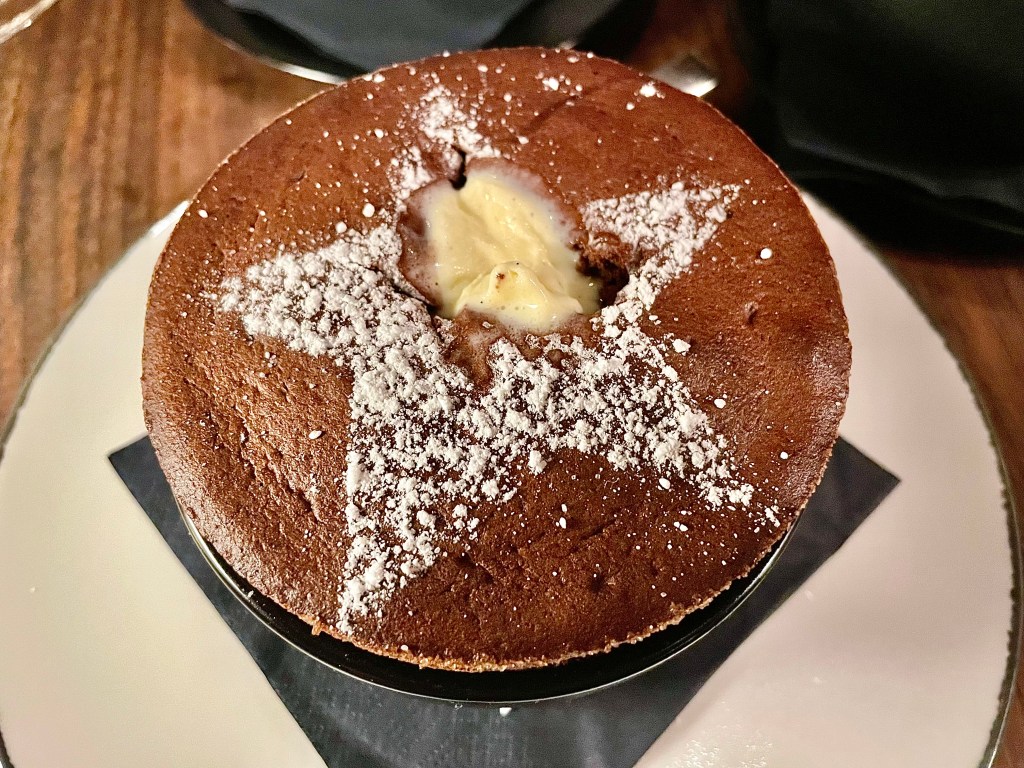 No savory dish from the bistro-focused menu at L’Avant-Garde on our visit was priced at $25 or less. Of the appetizers, we split grilled octopus accompanied by baby potatoes, olives and smoked paprika, at $31. We liked the spicy kick from the harissa aioli, but Jun wasn’t sure if this was the best octopus she had ever tasted. The two main dishes were also more memorable for their hefty price tag than how delicious they were. $53 got us a dish of four sea scallops with bone marrow and black truffle; while the scallops were capably grilled, we were quite surprised that there was overly heavy use of pepper that significantly undermined their texture. Is the chef an unabashed pepper lover or did someone at the kitchen accidently dump pepper? We were starting to lean toward the former conclusion after encountering Chateaubriand, one of the signature dishes at the restaurant with whopping $62. To give credit where credit is due, the tenderloin fillet was quite wonderfully grilled, and we both had very high praise for the texture. But again, why so much pepper that overwhelmed our palate quickly? After mixed experience on the savory side, we were quite pleased with the delightful lemon and white chocolate panna cotta with lavender honey ice cream which provided a nice break from all the peppery flavor. On the other hand, Jun felt that she had had better souffle elsewhere than the one presented from the kitchen.