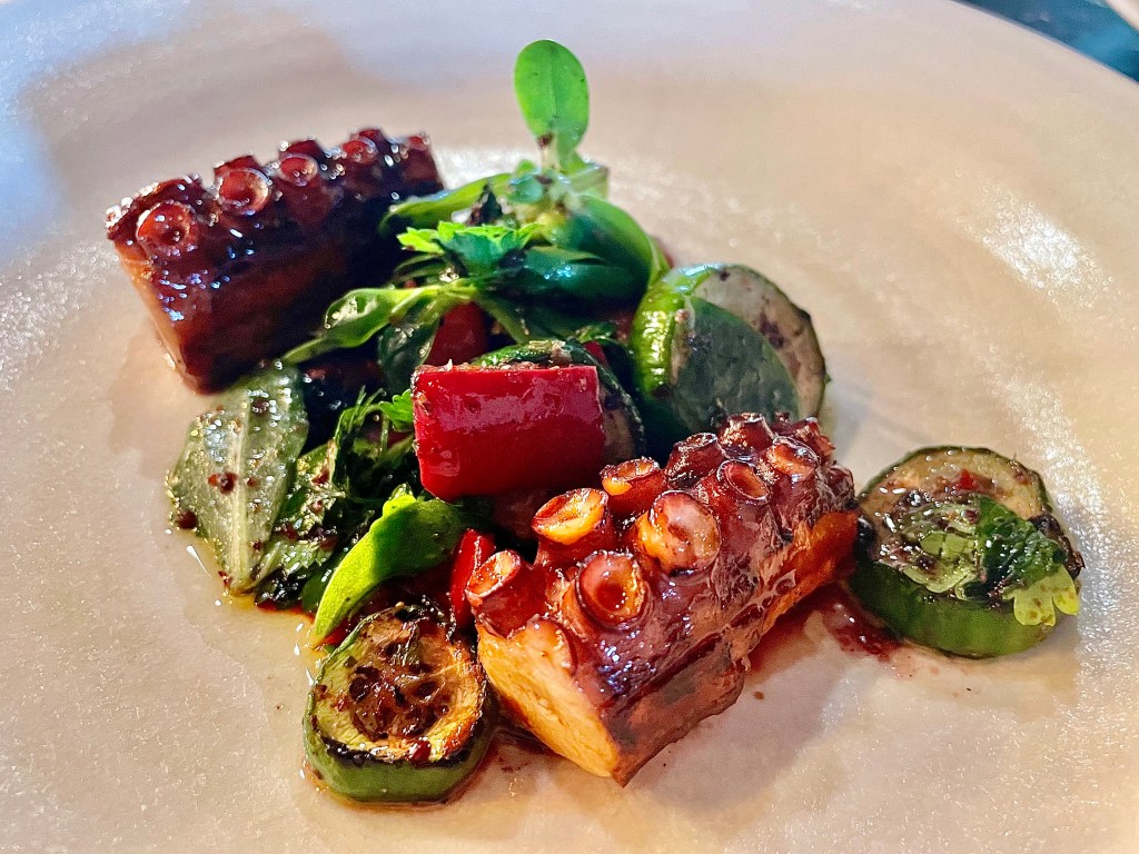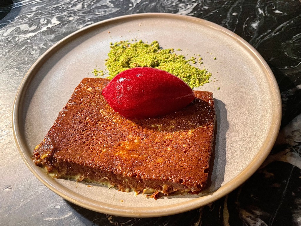 There were so-so dishes like octopus which was slightly tougher than the ideal texture, and an expression of düve sucuk (think sausage similar to chorizo) that was a bit too strong in flavor. But the restaurant had more hits than misses, like the competently prepared grouper with charred leak and sorrel sauce, followed by another favorite of mine of the night, slow roasted lamb shoulder with pilaf rice and salted yogurt. We certainly had our fill of lamb dishes throughout our journey in Turkey, but this lamb shoulder was undoubtedly the best one I’ve had, with exceptional texture and no gamey flavor. For dessert, a colorful dish of pistachio and cherry ice cream offered a delightful finish to our meal.