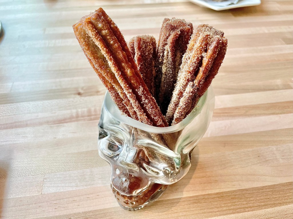 For the main dish, we shared arroz Amarillo with duck confit, which was a rather unusual food item (instead of, say, seafood or pork) for a Spanish rice dish, but turned out to the right choice. Jun was very appreciative of the rustic flavor of the duck confit that blended very nicely with baby radishes, mushrooms and cherry tomatoes as well as bomba rice. If there is one dish at The Saga you absolutely must order, the arroz Amarillo gets our vote of confidence. The desserts at The Saga could also use some work. The chocolate mousse with EVOO caviar was just OK, and we were surprised that the porcini churros with chocolate sauce on the side didn’t have quite the crispy texture we were expecting.
