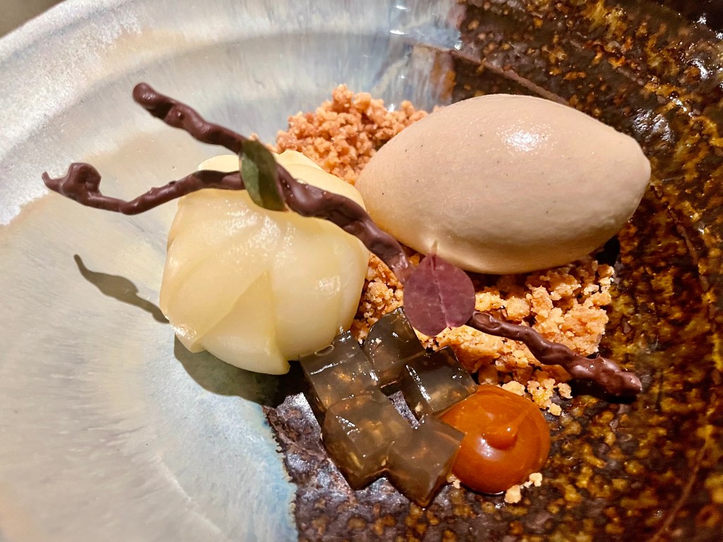 There are some sashimi (otsukuri) and nigiri sushi (shokuji) dishes that came throughout that would beat most of the sushi restaurants in the country in terms of quality of fish. If I had to choose my favorite of the night, it was a remarkable dish of spaghetti (shiizakana) with abalone, pickled cod roe and truffle; it was a much more sophisticated and refined form of mentaiko pasta we had tried at izakaya restaurants before and I savored every bite of this beauty. The dessert courses that came after the savory dishes were similarly prepared with ingenuity and high level of execution, with the apple sorbet (mizumono) with shiso and yuzu granita serving as a terrific palate cleanser, followed by another beautiful presentation with poached pear, hojicha and vanilla bean ice cream and butter cookie crumble that was quite apt for a fall dessert.