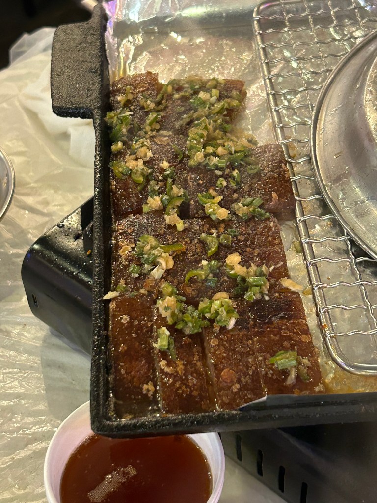 Before we left Seoul, my brother insisted on taking us to a restaurant nearby my family’s home that showcases naeng samgyupsal (frozen pork belly). One of the dishes that caught our eyes was dwaeji ggupdaegi (in Korean means pork skin). Neither Jun nor I had tried this dish much before (I might’ve tried after drinking too much soju before but couldn’t remember having one delicious enough to remember), but I’m so glad we were able to try it. Supposedly, this part of the pork is beneficial to your skin but that’s not the reason I loved it. The texture of the skin after some grilling because wonderfully chewy (without putting too much stress on your teeth) that was nothing like you would experience outside Korea.