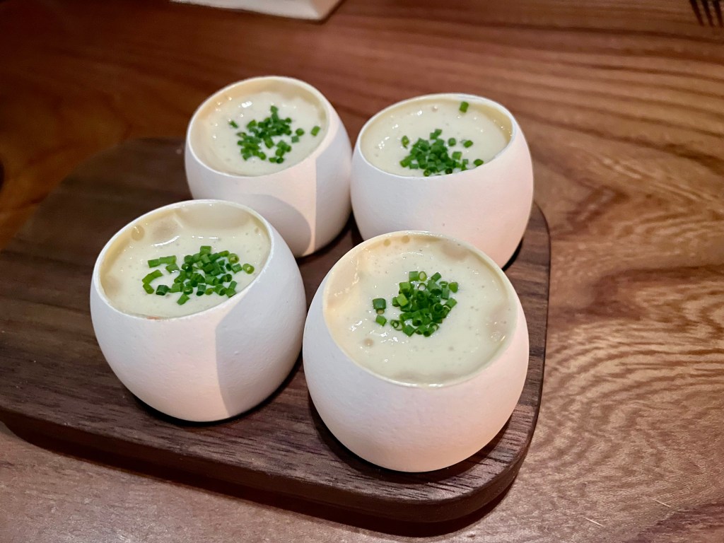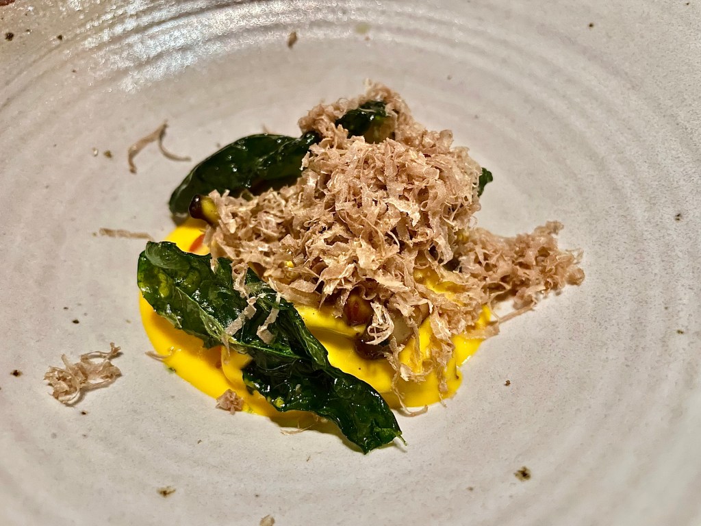 The tasting menu at Lazy Bear consists of about a dozen courses running at close to $300 per person. There is also an option to pay extra for desserts and dessert wine flights in the den upstairs. On each course, our server ever so enthusiastically explained the concept and ingredients, perhaps a little bit longer than necessary. After all the mini lectures on how each dish was prepared, however, Jun and I couldn’t help but notice that there was no “Oh my god, this is truly extraordinary!” item during our meal. Yes, the whipped scrambled eggs with bacon and hot sauce were playful. Sure, the “feast of seven dishes” featuring a variety of fish and shellfish were all fresh and well-executed.