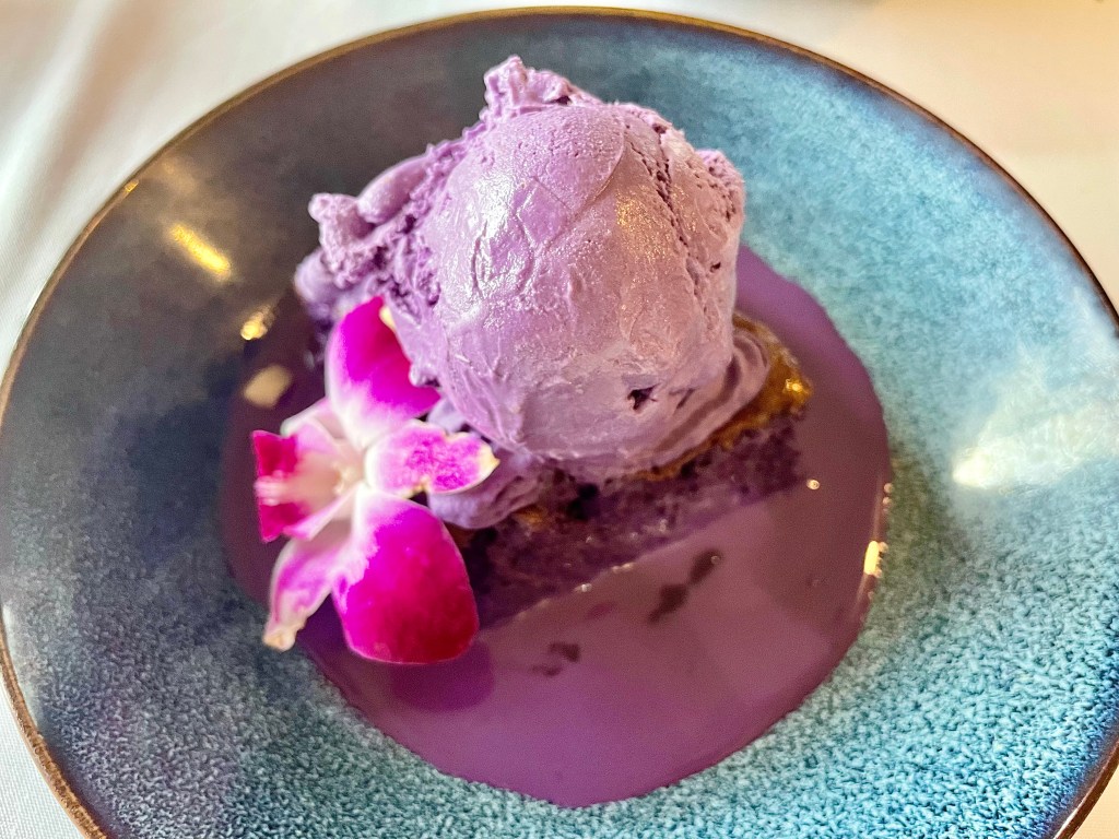A Filipino meal typically starts with lumpia, or fried spring rolls. The one at Purple Patch, with fillings of beef, pork, carrots and scallions, that you can dip on banana ketchup and spicy vinegar, would certainly get you on the right footing before your move on to bigger dishes. On the other hand, the chicken wings, which Jun insisted that we order (we ended up getting the spicy calamansi version), were underwhelming, particularly with a surprisingly dry texture of the poultry. If there is one dish that you absolutely have to order at Purple Patch, it is the sizzling pork belly and shoulder sisig. Just listening to the sizzling sound as our server brought out the dish immediately my mouth water, and the dish indeed delivered with its wonderfully fried pork and distinct flavor from soy sauce aioli. The sisig was definitely a star in our meal that it ended up overshadowing the short rib adobo braised in coconut milk soy sauce. Of course we needed to try at least one dessert with ube based on purple yam, and I could tell that Jun enjoyed the ube cheesecake with ube ice cream scoop that was addictive in a good way. If you have some extra room, the leche flan is also a solid option.