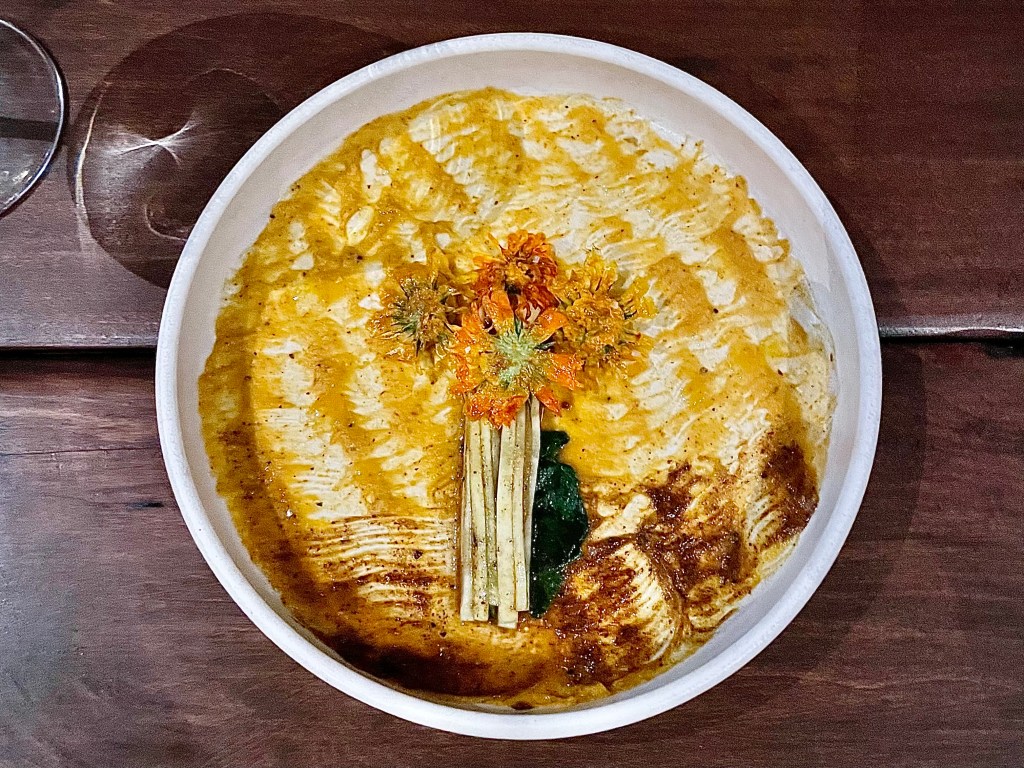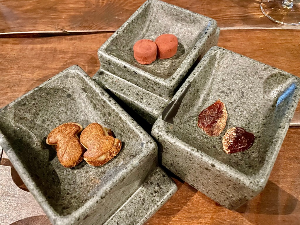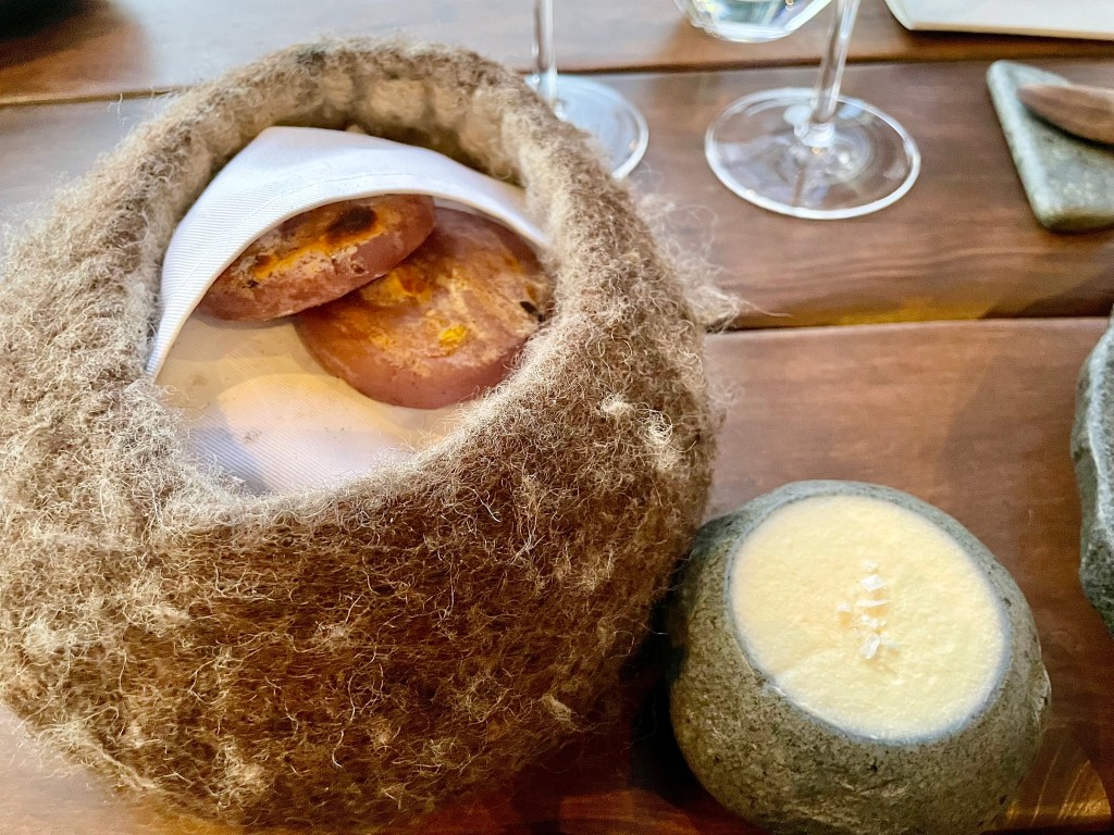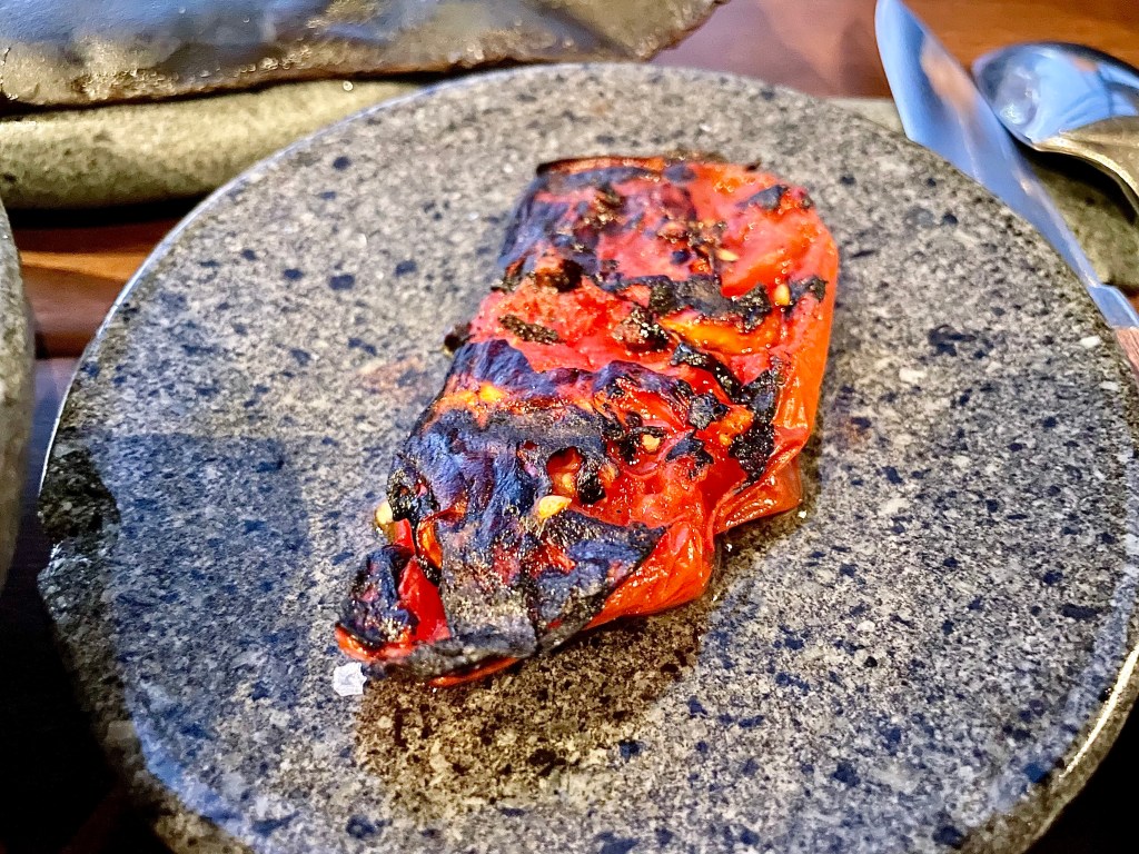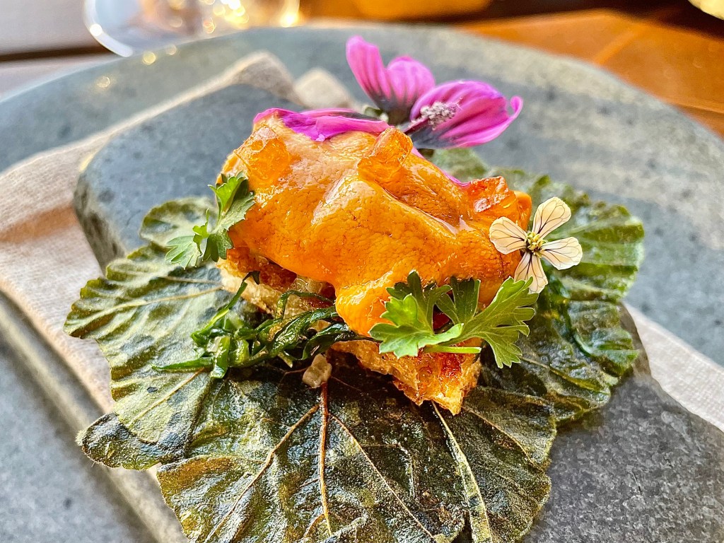 As we got settled on our table, the postcard from the restaurant immediately caught my attention. It was a thoughtful presentation of Chile’s geographical landscape from which ingredients for the dinner were sourced from. Chef Guzmán is very committed to showcasing the native ingredients from more than 200 collectors and small producers across the country, with a focus on seasonality (the restaurant changes menu each season) and sustainability. You will see some stunning presentations of the dishes at Boragó from the beginning like we did with pink tomato pebre and chancho en piedra (think Chilean salsas) on an actual plant and the tasty bite of a bee made of truffle and alfalfa. One of my favorite dishes from the night was scallop crudo with seaweed extracts that worked quite well with the crunchy cracker underneath, and we were also fans of fresh seafood “garden” inside a beautiful Chilean bellflower called copihue.