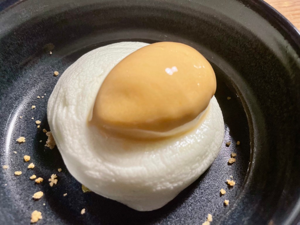 The larger courses that followed had some really delicious dishes and others that were somewhat mixed. I liked the smoked bonito tuna with fennel jus and dill as well as blow-torched yellowtail with red bell pepper consommé; on the other hand, Jun felt that dep fried skate fish cheeks could’ve stood out on its own without the yeast Hollandaise sauce that somewhat undermined the fish’s flavor. The last savory dish was a playful surf and turf combination of white prawns and roasted chicken, with truffle supplements we opted into; our only minor complaint was a somewhat modest portion (perhaps we should’ve opted for the longer tasting menu). Between the palate cleanser of pickled apricot sorbet and the main dessert of kefir peanut sorbet with brownie and spicy toffee, we preferred the latter which, as our server explained, was a deconstructed version of Snickers.