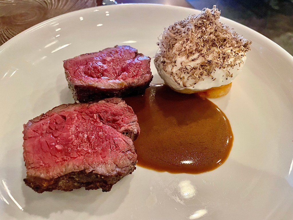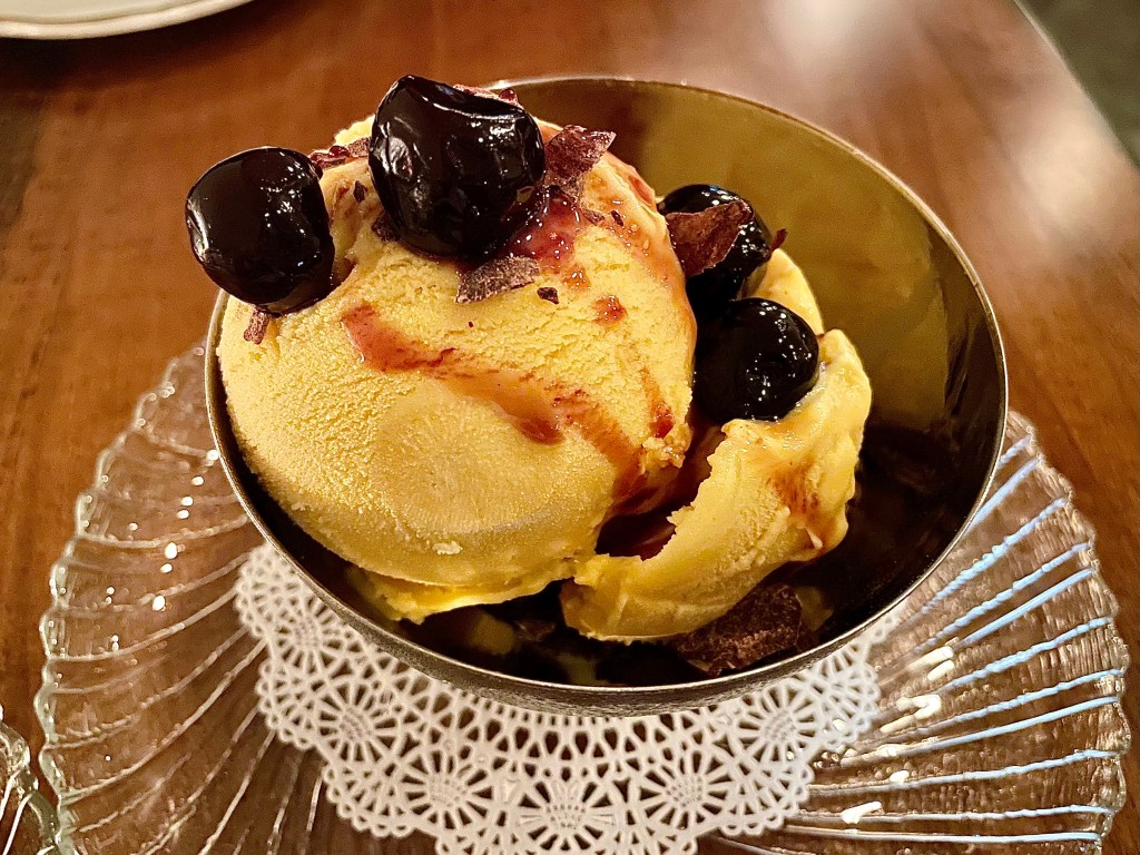 On the other hand, one of the signature dishes at the restaurant, chorizo dumplings with pork sausage, pecorino sardo and mushroom immersed in kombu brother, was a slight letdown, and we both thought the seasoning could’ve been slightly toned down. Given Uruguay’s reputation for beef, we had to try the steak, accompanied by black truffle, potato and onion jus. Jun was complimentary of the steak’s quality (grilled at around medium rare) with its juicy, tender texture; I agreed that the steak was indeed quite delicious but wondered if the price ($55) was somewhat steep given the portion. The restaurant also had some tasty desserts. If you are not a sweet tooth, you would be won over by the restaurant’s take on a traditional Uruguayan dessert called Martín Fierro with cheese mousse and quince. We also enjoyed the refreshing sabayon ice cream with black cherries.