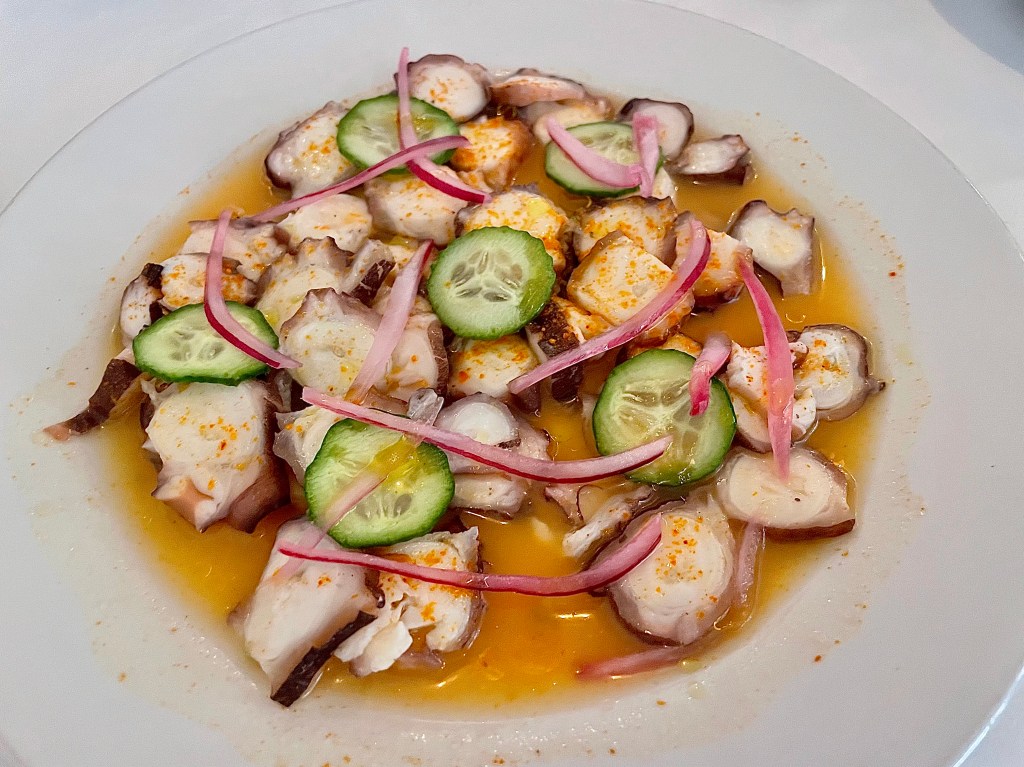 When we were going through the vast menu with our server and asked for a recommendation, he immediately turned to the tuna and sea urchin tostadas. We’ve had tostadas at multiple Mexican restaurants before, but the one from Entremar was really something else. The combination of texture between the fresh tuna and sea urchin was a marvel! I was hoping to try a few other dishes after the first order of the tostadas but after the initial bite, I couldn’t resist ordering another one right away. Even Jun, who is typically not a huge fan of sea urchin, admitted that it was a difference maker for the tostadas. Our server also recommended the “al pastor” king fish tacos with onions, cilantro and pineapple inside, and we also tried the octopus aguachile with red onion and chile of cuaresmeño (think jalapeño pepper). Both dishes were solid overall as well, with the tacos showing a unique smoky flavor of grilled fish, and the octopus with tender texture that would be a nice snack for a lazy afternoon.