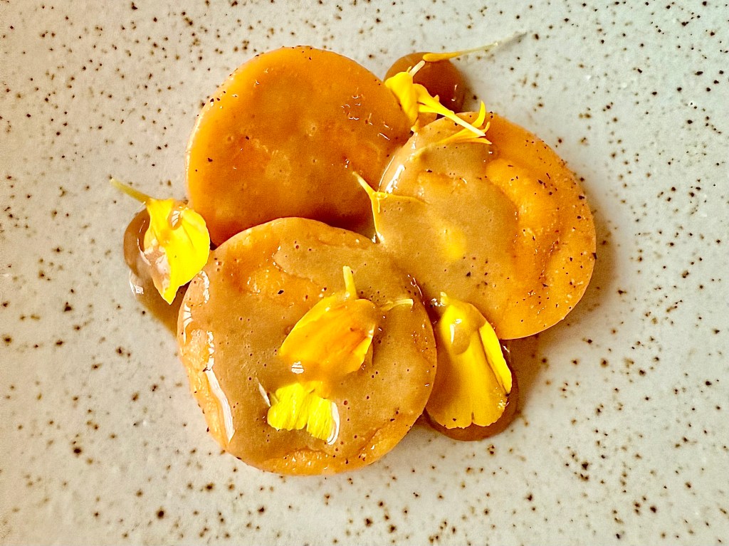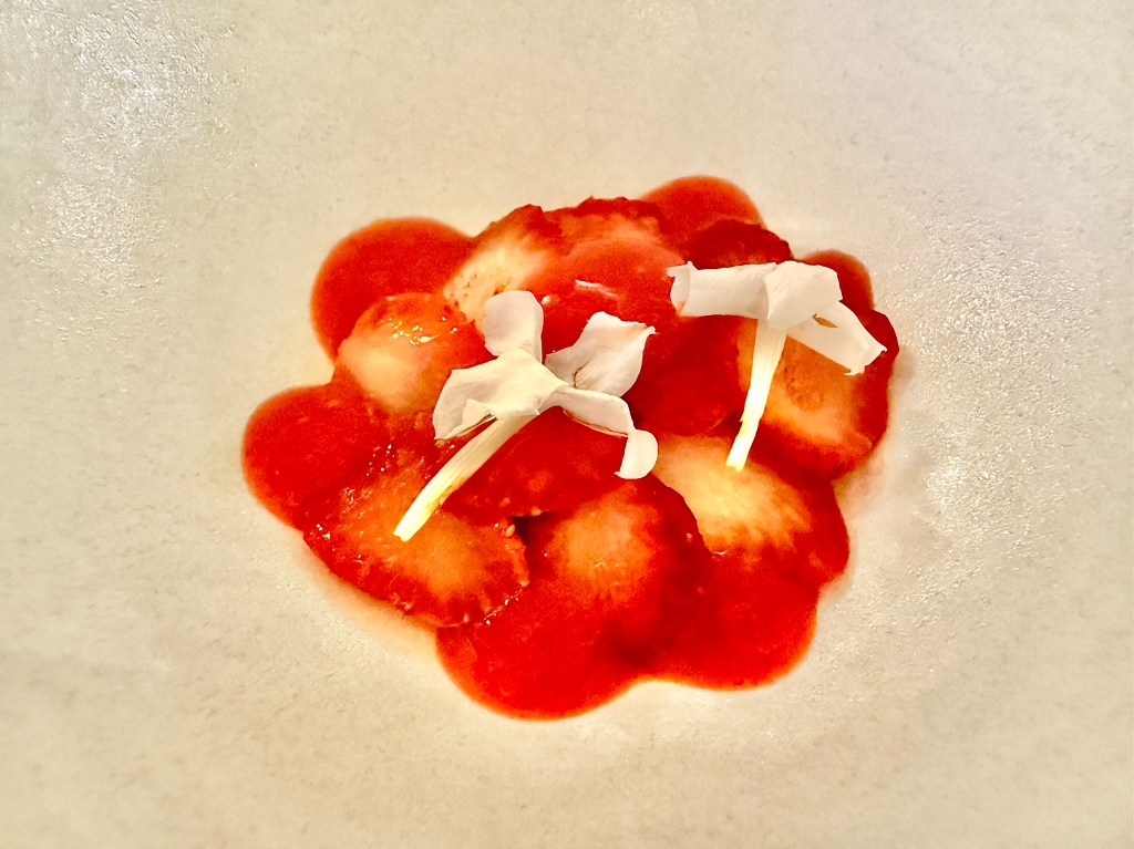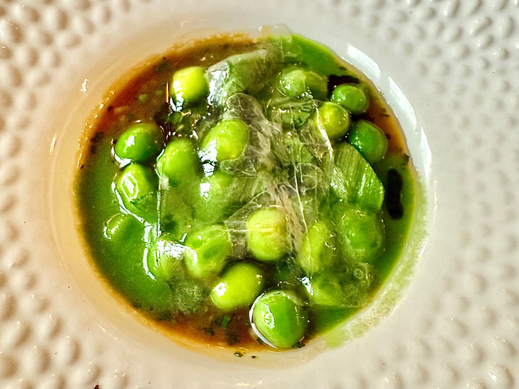 The tasting menu at Géosmine, consisting of 11 items, is a relatively bargain at €140 per person. After a few whimsical snacks like black garlic and anchovy cream cracker and fermented white asparagus tartlet, we started getting some wonderful small plate dishes. I was very impressed with the ingenious touch coming from the kitchen. It only came in three pieces, but the apricot and lobster pasta with lobster bisque left such a lasting impression that I could’ve eaten an entire meal just with this dish. A bowl of pea in beef jus and thin slices of guanciale on top was another winner that I enjoyed very much, as was dry aged tuna with cauliflower accompanied by fish and butter sauce.