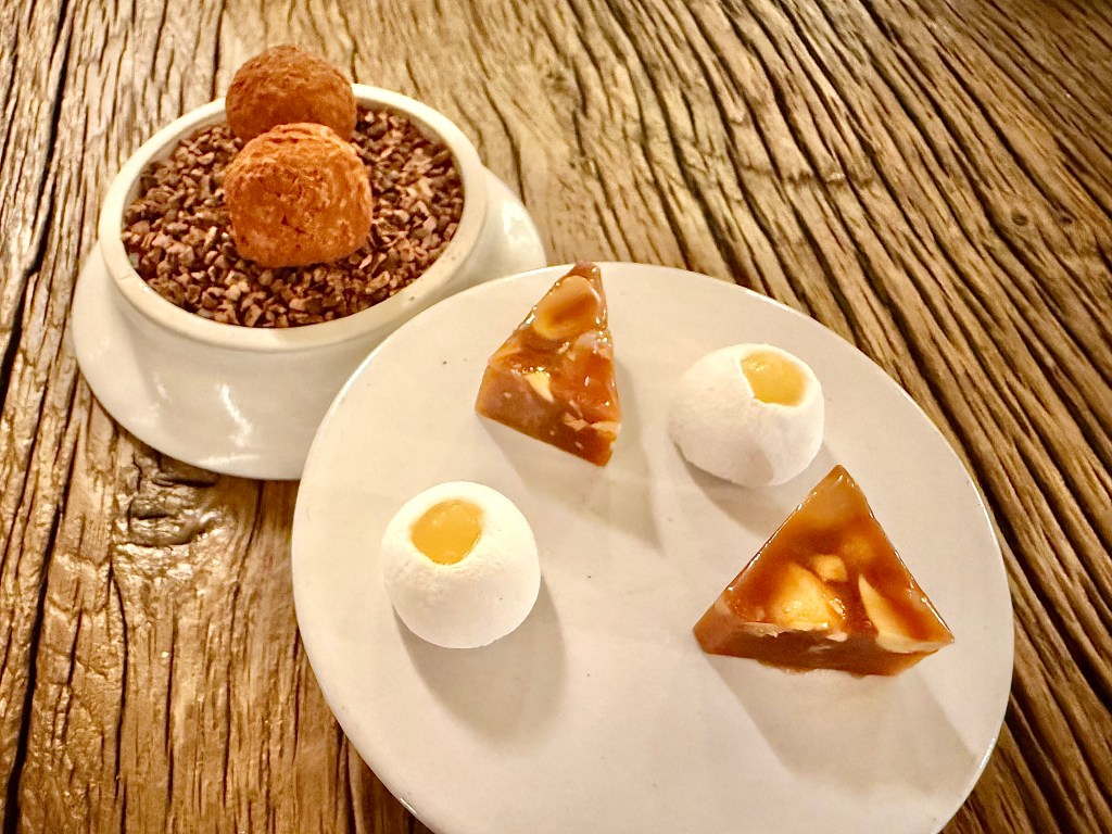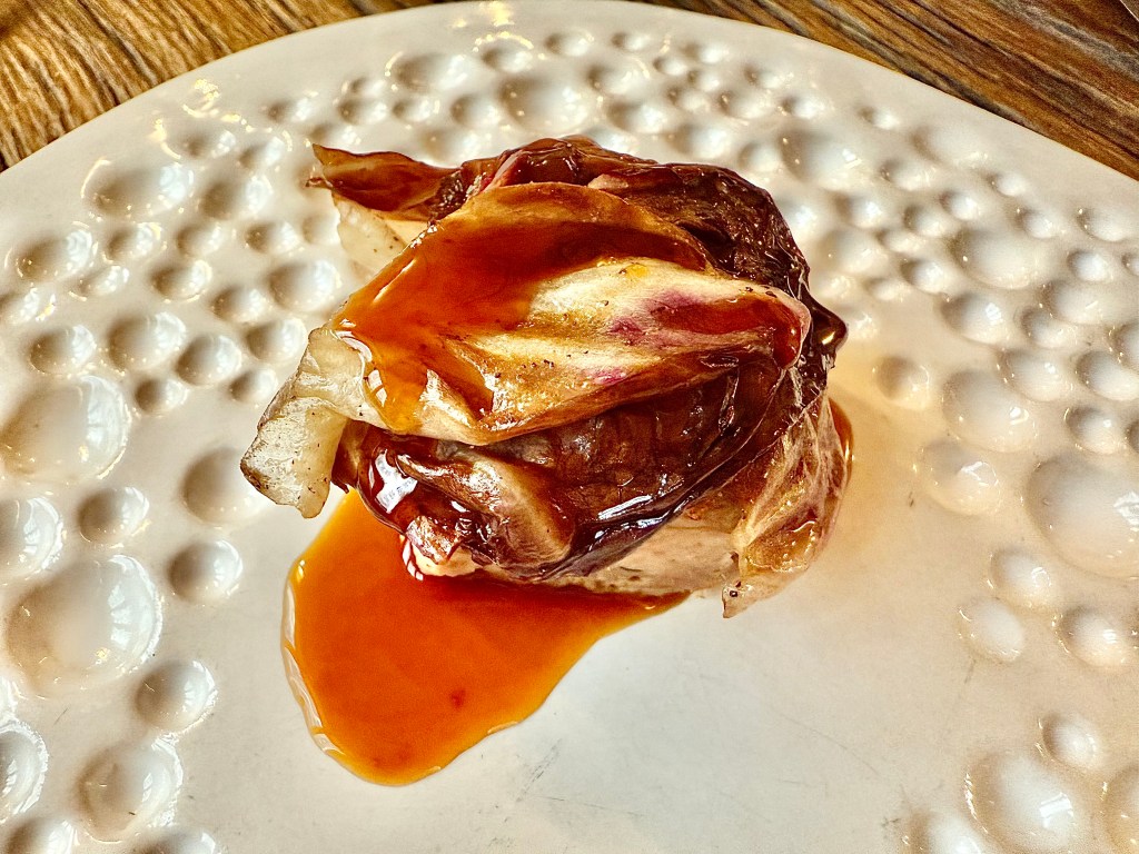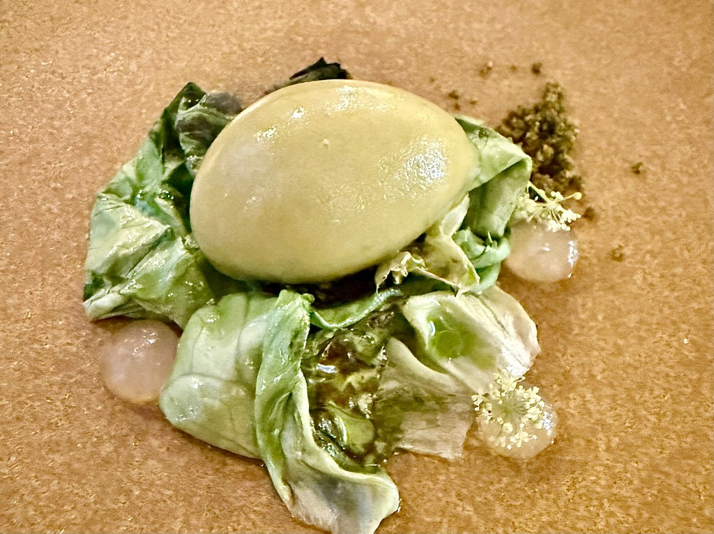 A duck dish is often a reliable sign of how good a restaurant’s kitchen is, and Géosmine delivered here with a beautiful dish of duck confit with radicchio on top and accompanied by red cherry compote. Compared to all the hits, the only slight miss was the last savory course. When our server brought an artichoke dish, he said there is a “secret ingredient” added to the artichoke. Later, we found out that the ingredient was cow udder, and it wasn’t quite as noticeable was I thought it would be while splitting the artichoke. Another favorite dish of mine from the dinner came into the form of palate cleanser. I’ve certainly seen a fair number of dessert dishes incorporating vegetables by now, but the apple and parsley sorbet on top of lettuce was a brilliant touch with very unique flavor. We finished our meal with strawberry and rhubarb compote, then followed by a delightful bowl of chocolate mousse with salt sprinkled on top.
