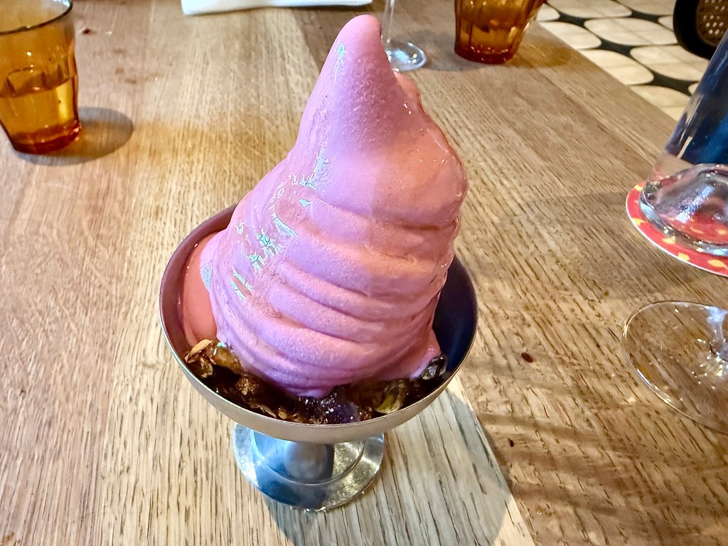 While the “(not) pizza” section is the centerpiece of the menu, YELLOW offers so much more. Before you would like to try a few appetizers to get you going before indulging on the pies, there are some really good options in the mezze section. We both really liked the fattoush salad with tomato, feta and crunchy pita for all the freshness of the ingredients, and Jun had a very high praise for the smoked lamb ribs which came wonderfully soft in texture. Of course, we couldn’t skip a hummus dish given all the wonderful hummus we’d tried from Albi, and the lamb awarma hummus was spot-on. If you are planning to order a pie at YELLOW, don’t bother ordering an extra pita to dip on the hummus; the doughs from the pie will more than adequately do the job for dipping. We ended up with smoked oyster mushroom pie (accompanied by lemon ricotta and pickled beech mushroom), and it was one of the best pizzas I remembered having in the DC Metro area. The smoky flavor from the mushroom was quite memorable, and the extra chewy dough was addictive as well, especially with the hummus. Jun and I both knew we were starting to get overloaded with carbs, but we couldn’t stop until the pie disappeared! For dessert, our server highly recommended a soft serve with Concord grape flavor, and it turned out to be a wise choice, especially with candied pistachio that offered wonderful crunchy texture to match the soft serve.