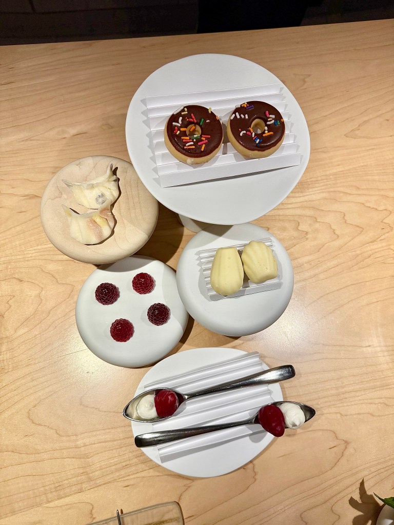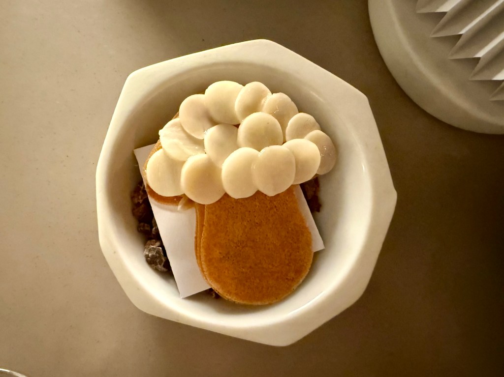 The savory section of the course ended with Iberico pork with caramelized onion puree and morel mushrooms. Compared to the other dishes that came before, this was surprisingly a little bit pedestrian, especially the pork’s texture which was a surprise given how much we enjoy Iberico pork. The dessert courses kicked off with another fun and playful dish of “cow and her milk” with cow cracker, cheese and apple to transition us nicely from the savory to the sweet. The main dessert called silenci d’hivern was a delightful combination of yuzu panna cotta and rice miso. We finished the meal with golden kiwi followed by a number of small snacks. The entire dinner took us over three and a half hours (starting at 7:30 p.m.) and by the time we departed for our hotel, it was close to 11:30 p.m.