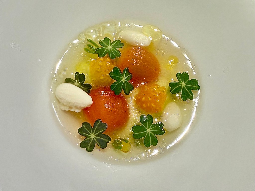 We were first led to the garden outside the restaurant when we arrived. Along with a glass of champagne (more on the wine list later), we were treated with a number of different small bites starting with the playful “truffle” bump on top of a prosthetic hand. Among these small bites, some of my favorite included sardine cracker, trufflecini and mussels “tigre.” Afterwards, we were led to a long counter table facing the kitchen and the main tasting menu commenced. The opening dish made a deep impression, an ingenious re-interpretation of “pizza margherita” with tomato meringue, ricotta and black truffle that just melted in my mouth with awesome umami flavor. The next dish was one of Jun’s favorites, as she was very complimentary of the fresh tomato with frozen almond milk in the gazpacho “blanco.”