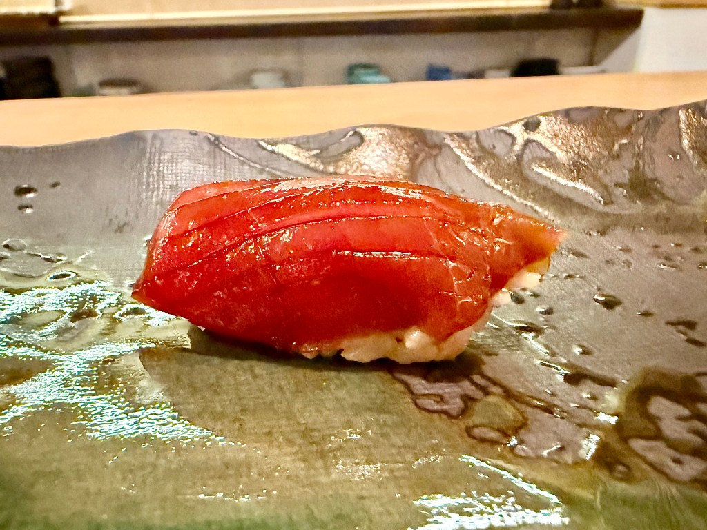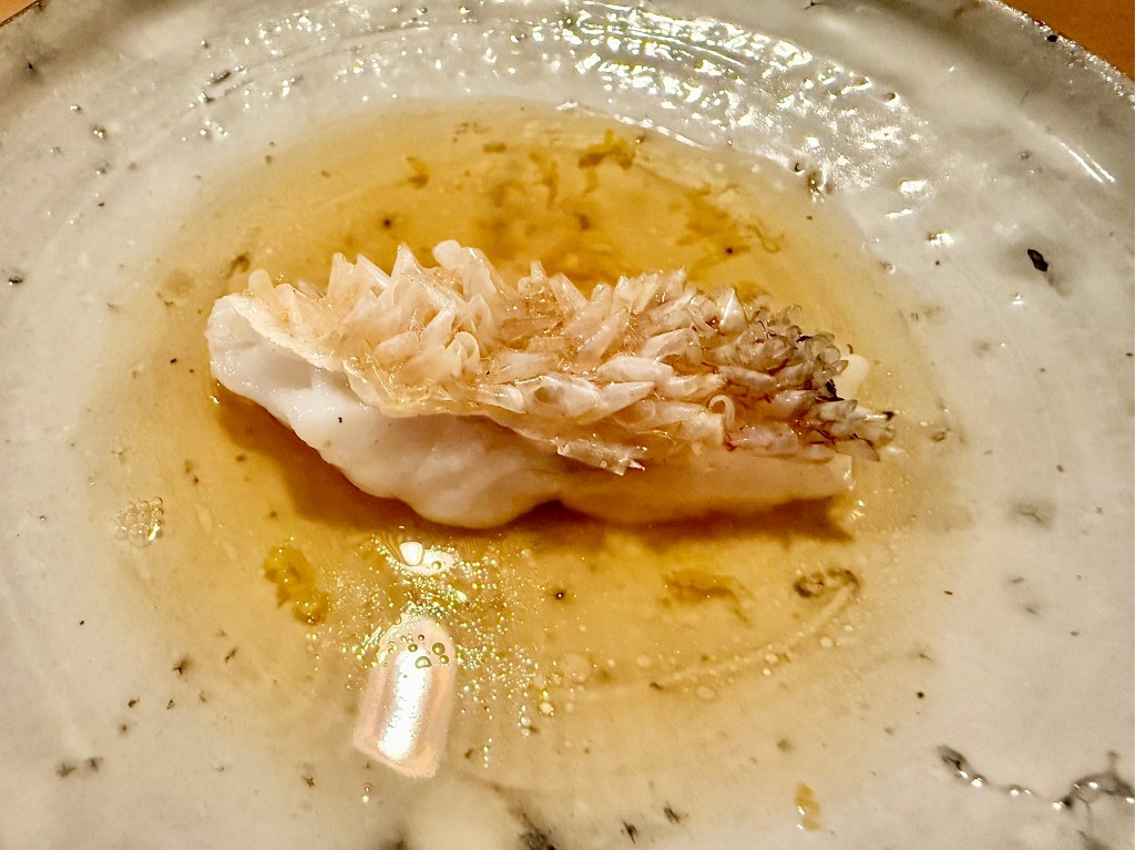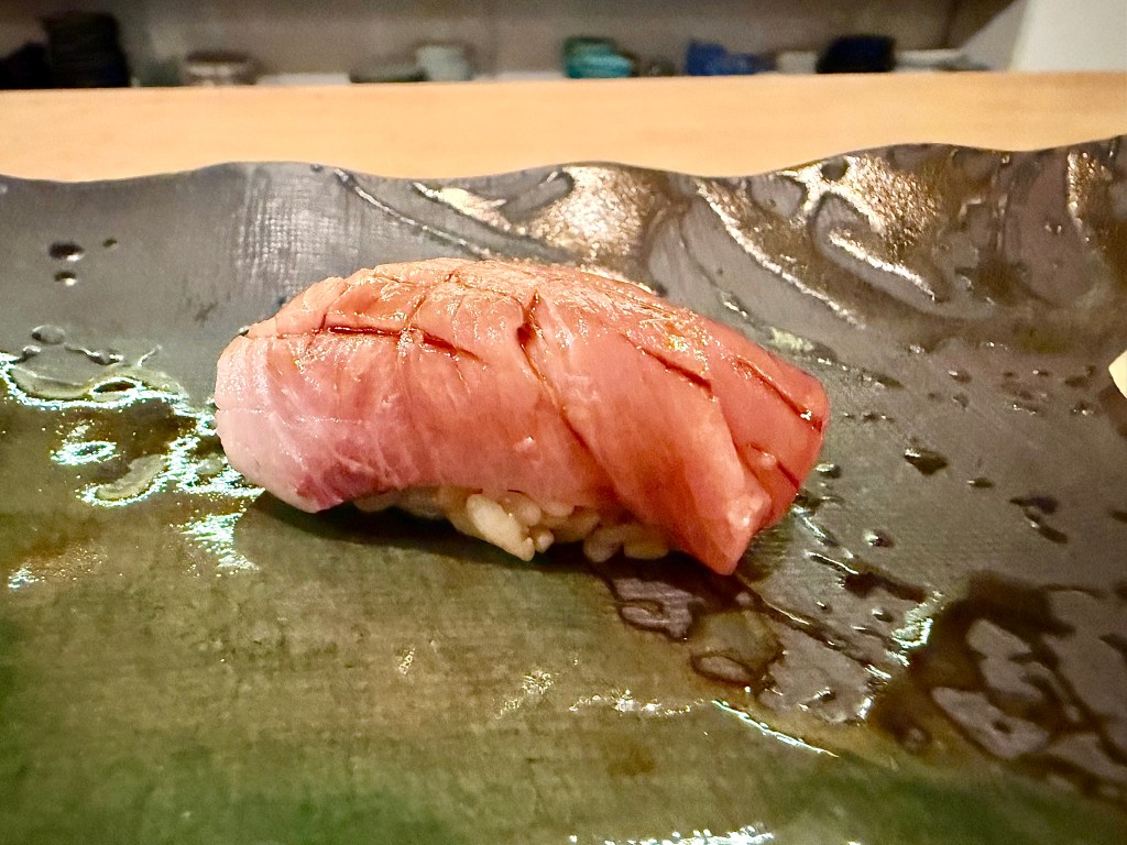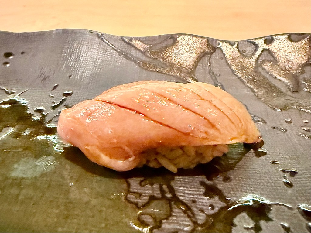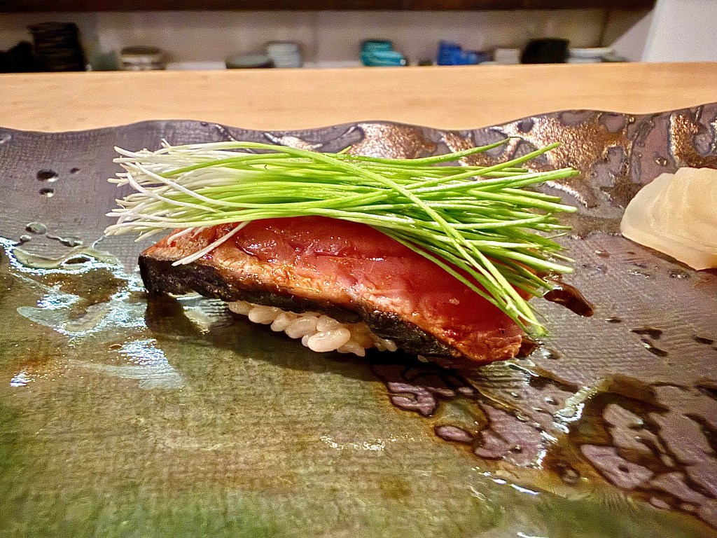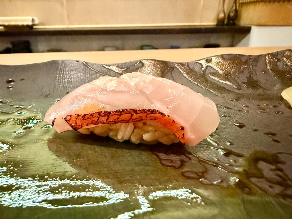 The chef Daniel Son, a second-generation chef, is in charge of all of the dishes at Sushi Sonagi, which has a single counter table with two shifts per night. What really stood out about the omakase at Sushi Sonagi (the menu costs $250 per person) is chef Daniel’s openness to experimenting with ingredients not typically used at a sushi restaurant, as well as the overall balance in flavor of all the dishes. The opening dishes featured a super delicious chawanmushi with snow crab and (unexpectedly) sweet corn. The fried green eyes fish was also another delightful item on the course, as well the mackerel sandwich that Jun really enjoyed even though mackerel is not her favorite fish. My two favorite dishes before the nigiri section were the black abalone (sourced from Korea’s Jeju Island) with liver sauce – this is one delicacy that I won’t stop thinking about for a while – and monkfish liver (which had a bit of wasabi on top to a surprising effect) that would’ve held its own against ankimo at other top-end sushi restaurants.