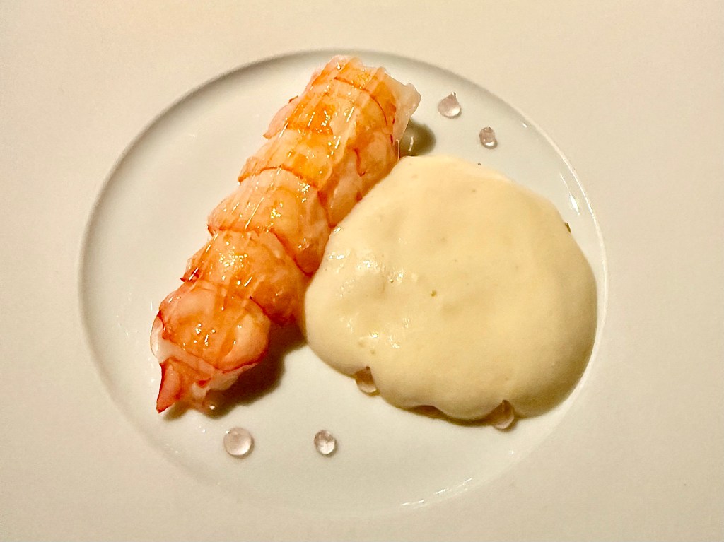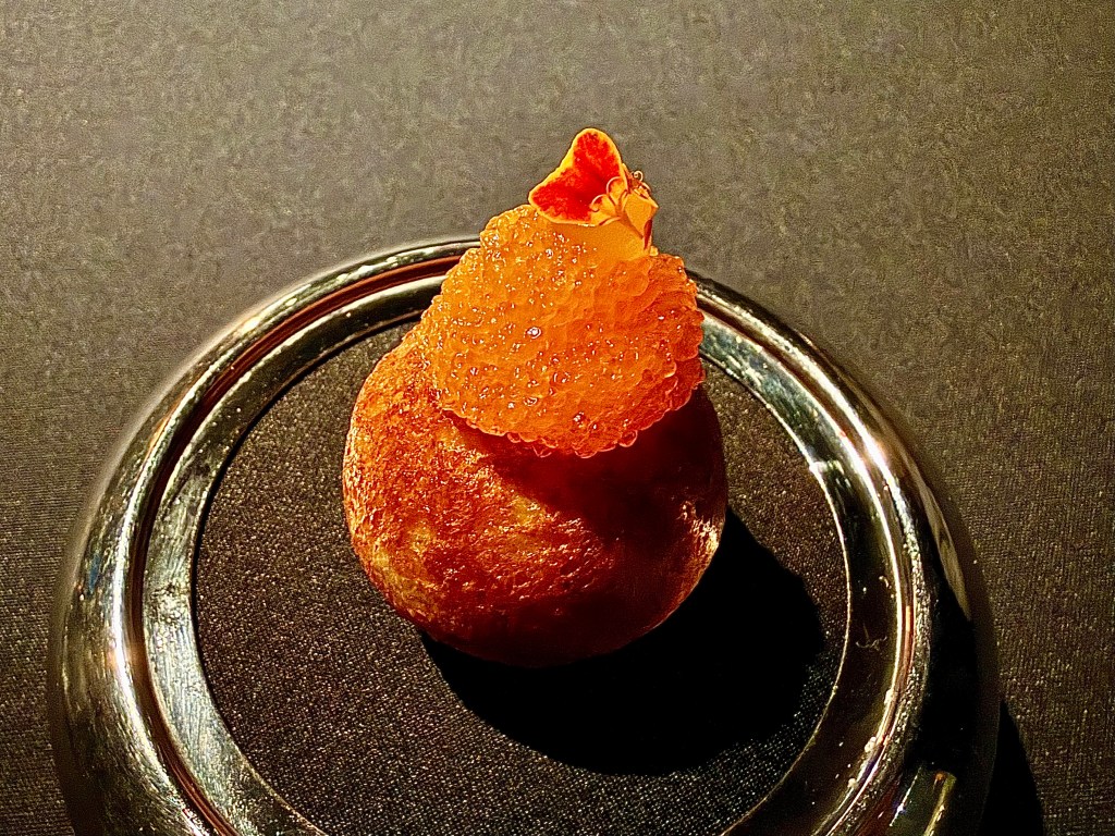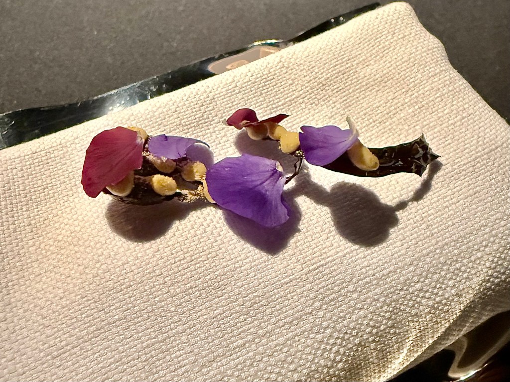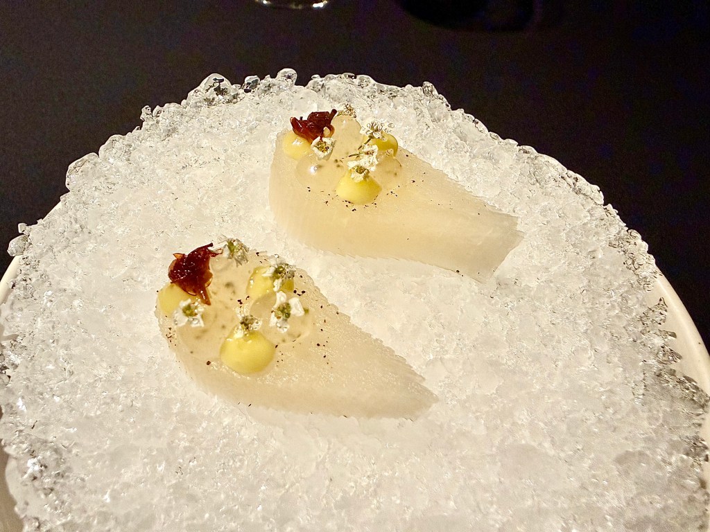I guess I would preface by pointing out that Aska’s tasting menu hasn’t dramatically changed in the past several years. There is a core of signature dishes that has remained the staple of the restaurant, with a few variations seasonally. We probably might have visited the restaurant a little more often had we known the menu would go through more dramatic changes. That said, the level of execution has also been remarkably consistent over time. We have seen the kohlrabi snack (compressed with the essence of linden leaf oil and linden flower) multiple times already, but on this particular night Jun noticed how impressively crispy the kohlrabi tasted. There were also a couple of new dishes we had not encountered this time, like a rye pancake with vendace roe marinated in lilac vinegar, brown crab and custard of crab brain (seemingly a Scandinavian version of chawanmushi egg custard) and, one of my favorite dishes of the night, a delightful bite of kingfish, Madagascar caviar and smoked eel.