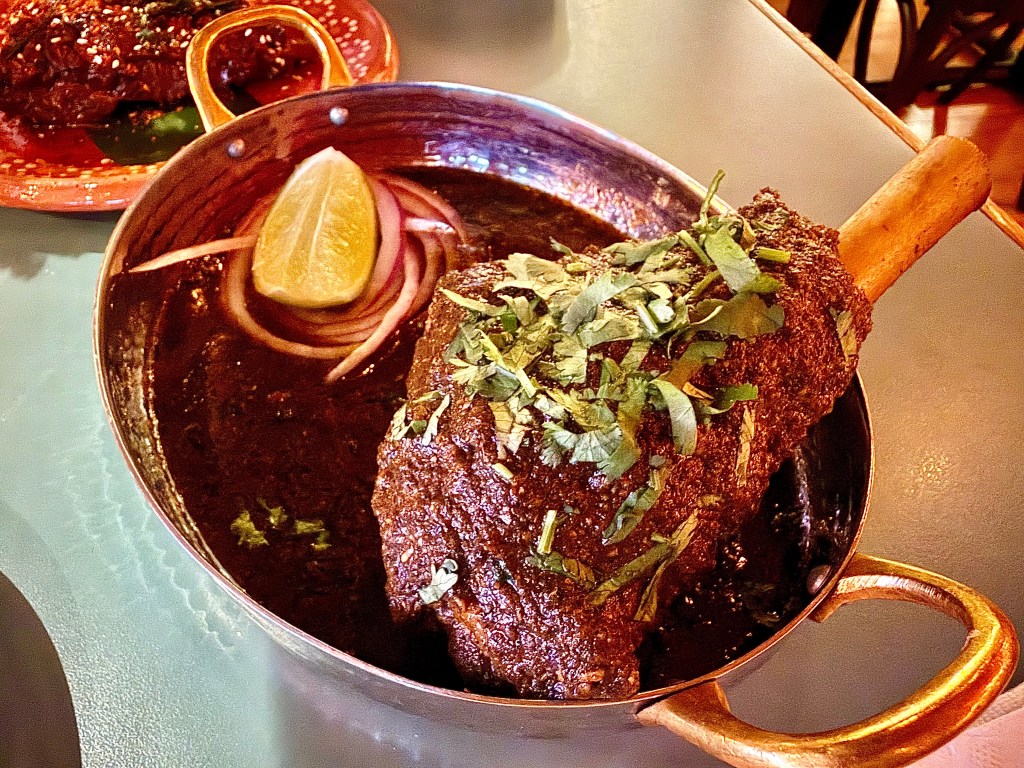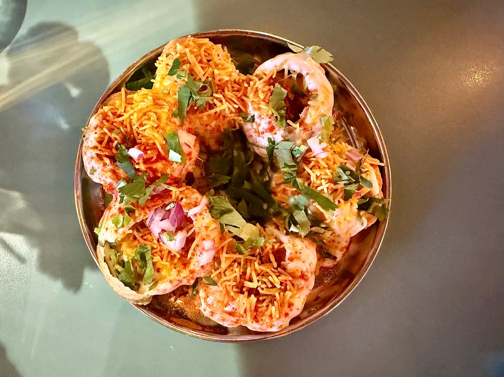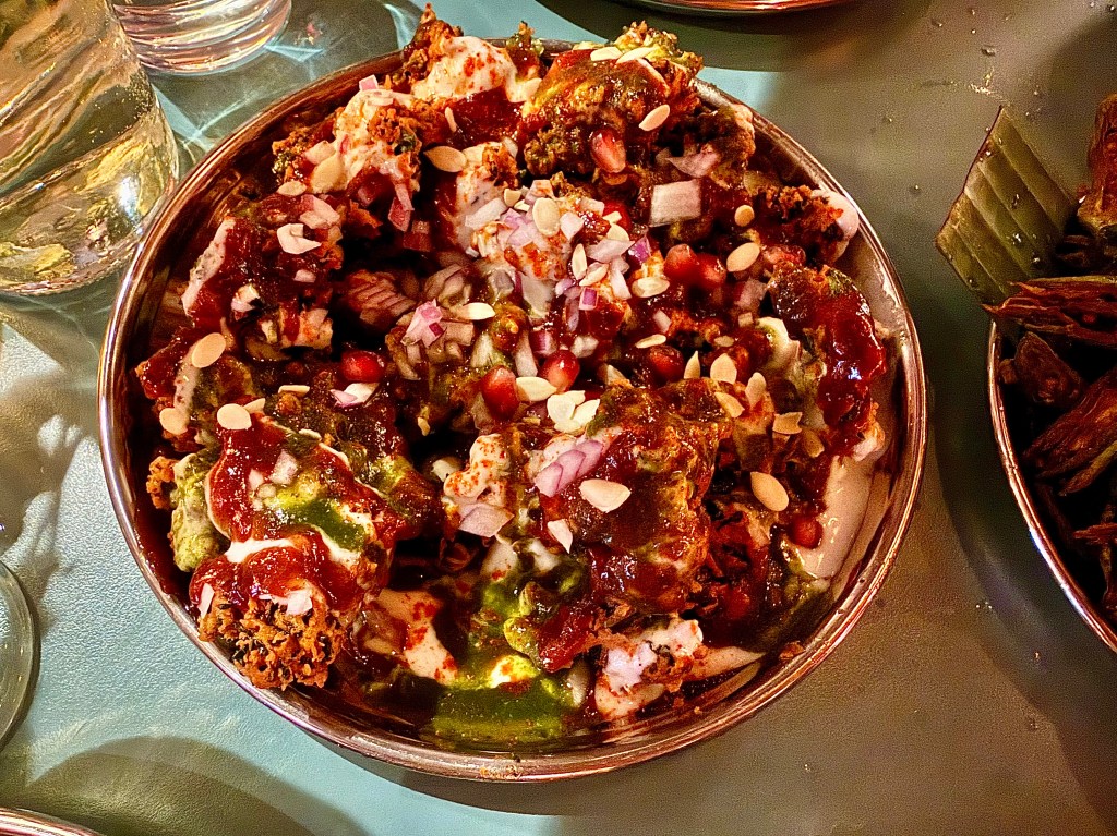 The chaat section of Chai Pani features a variety of street food dishes with fried ingredients. Jun’s general impression of the dishes we tried was that, after a few delicious bites, they became overpowering with flavor, almost to the point that her tongue got numb. The SPDP, a toasted puffed up puris flatbread stuffed with potato, red onion and cilantro, raised our anticipation at first but by the time we got to the third bite, the seasoning from sweet yogurt, tamarind and green chutneys became almost oppressive. Same for the kale fritter chaat that was described by the restaurant as “iconic” in its menu; knowing how much we enjoyed kale-based chaat at other places like Rasika, we wished we had enjoyed the version from Chai Pani more. The okra fries, tossed with salt and seasoning, were surprisingly pedestrian (despite the menu’s colorful description of “okra like you’ve never had it”). For the larger dishes, the tamarind-glazed pork ribs braised with ginger, garlic, soy and star anise were delicious but again the tamarind-ginger glaze required us to eat a decent amount of rice to compensate for the aggressive flavor. On the other hand, the slow braised lamb shank in a blackened onion masala with green chili was somewhat muted in the flavor by comparison; it might’ve neutralized all the overwhelming flavor from the other dishes but I couldn’t say it was on its own a standout dish that we would be happy to come back for.