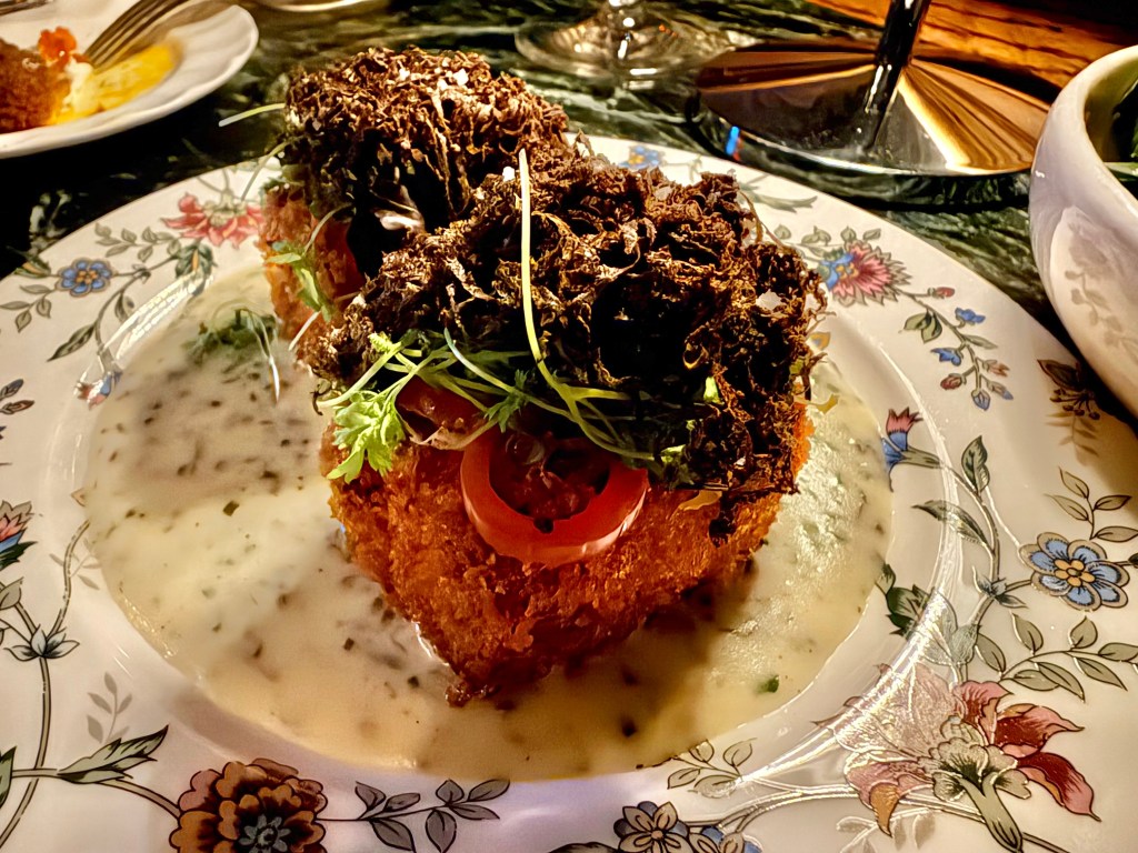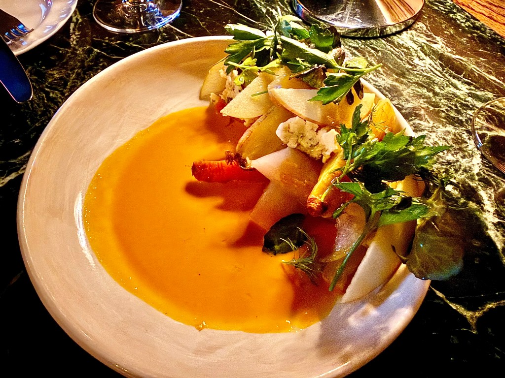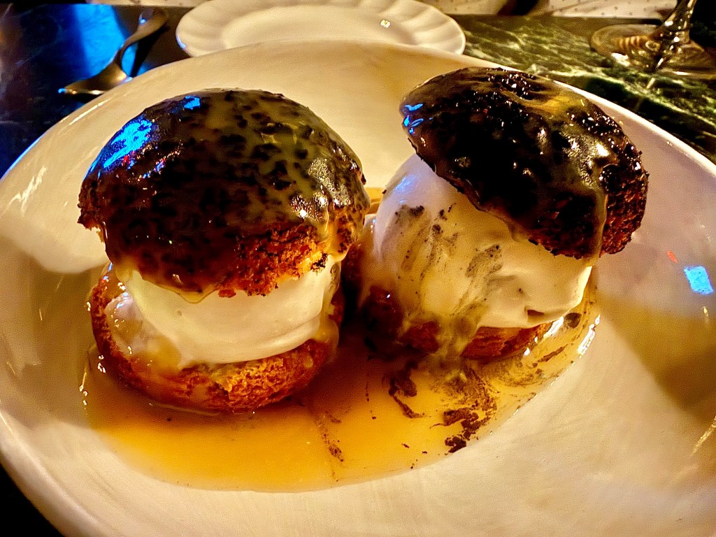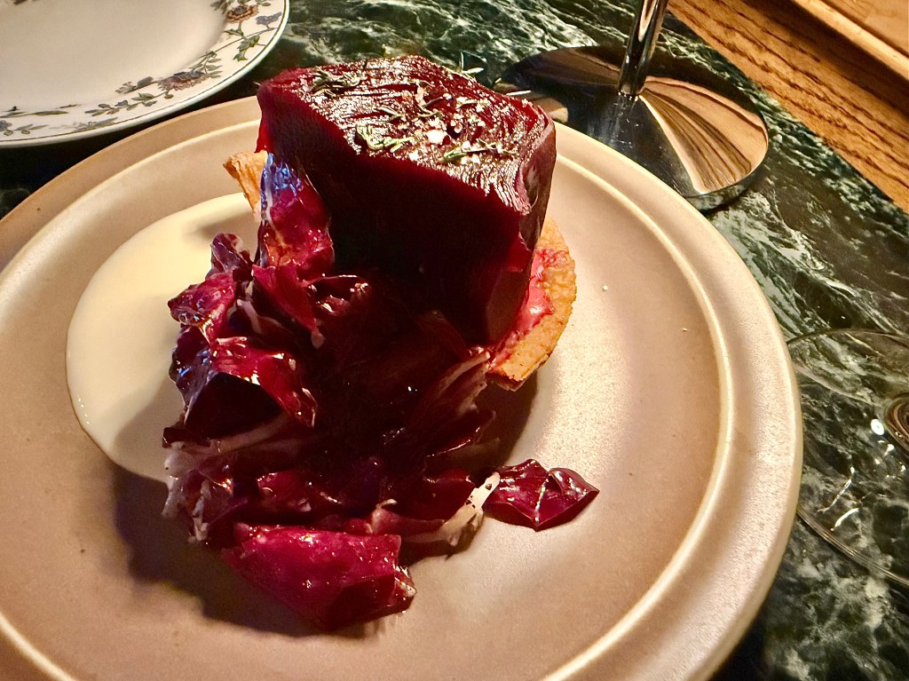 For the Maison project, Matt Conroy (the executive chef of Lutèce and Pascual) put chef de cuisine Jason Chaveson (formerly at Reverie; still can’t get over the fact it closed so abruptly) in charge of the kitchen, which is located downstairs away from the dining room. The relatively concise menu at Maison features mostly French dishes that are smartly prepared and also great for sharing. We both quite enjoyed the dish called tarama (a traditional Greek dip made from salted fish roe) inside seaweed choux buns. Same for the crispy tête de Cochon with rich, creamy Mornay sauce that was not as heavy as I would’ve expected. Getting one or two vegetables at Maison is also a wise choice. We liked the carrots with ‘nduja and Bleu d’Ambert cheese, but it was the dramatically plated beet tart (I certainly didn’t expect an entire chunk of beet on top of the tart) that really stole the show with terrific texture and freshness. For larger dishes, the brioche stuffed chicken seems to have quickly become a signature dish at the restaurant. The texture of the chicken breast was on point and the choice of green-colored brioche worked quite well. If you still have room for dessert, my vote is to go with the delightful profiteroles with banana and rhum that would not be out of place at a top bistro in Paris. We also tried the Basque cheesecake and Vin Jaune and wildflower-honey; based on the way Jun savored the soft cheesecake, I immediately knew it was a success.
