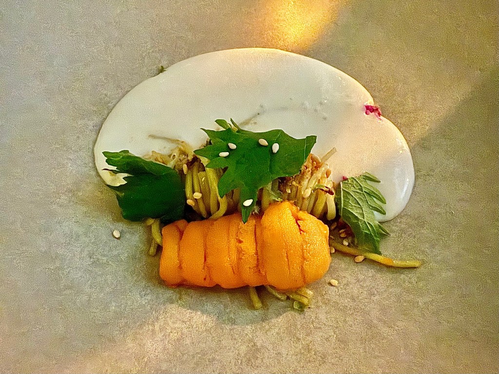 The tasting menu started with a few snacks of oyster, mussel, blue prawn and firefly squid. Among those, I liked the firefly squid (with gochugaru salt) and mussel (stuffed with hazelnut); I wasn’t sure if the strong flavor of ssamjang helped with the oyster. The marinated vegetables that followed were also delicious, especially with saffron aioli, but the sour flavor from the flower vinegar was slightly overpowering the entire dish. One of my favorite dishes of the night was Hokkaido uni with noodles made of gamtae (a type of Korean seaweed that seems to be used in many fine dining restaurants like Atomix these days). I was very fond of the creamy Billi Bi sauce that worked fantastically well with the spot-on texture of the noodles and the fresh sea urchin. On the other hand, the side dish of japchae felt out of place with its aggressive seasoning that was not what we were used to from the japchae dish that Jun’s mom would make for us. Another dish that Jun and I really liked was wild tai (or red sea bream) with smoky fish sauce and soft tofu; the fish was expertly cooked and the sauce had the sophisticated richness that would fit at another top French restaurant.