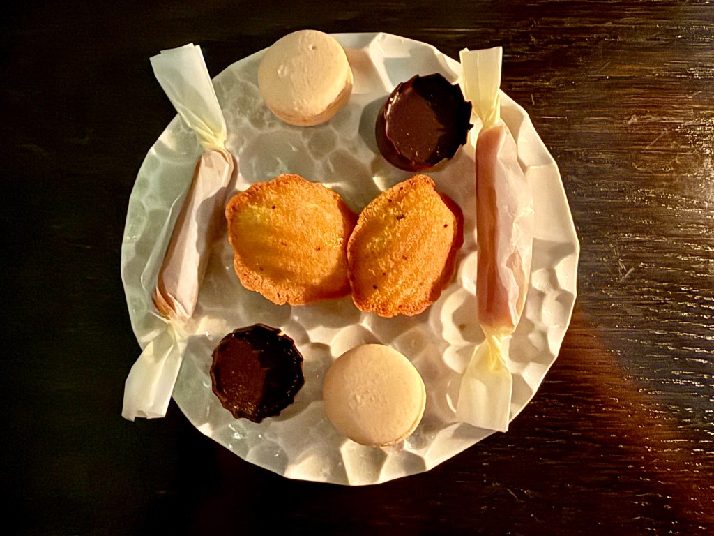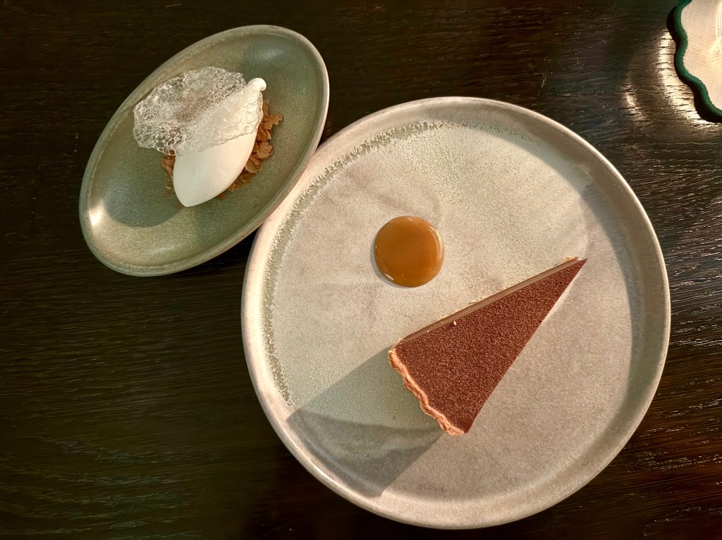 Compared to these bright spots, other dishes didn’t leave as lasting an impression, starting with the steelhead trout wrapped in seaweed in two different versions, or the scallop with green garlic and seafood-based Cancalaise sauce (I was actually more impressed with the side dish of stuffed morel mushroom). And we initially struggled to identify kimchi flavor from the butter that accompanied the delicious sourdough milk bread. The final savory course was Navarin of Lamb, accompanied by rice, mushroom-based soup and daikon kimchi. The lamb itself was stellar in texture, but the overall flavor was a tad aggressive that I had to neutralize with rice and kimchi. Among the desserts, I very much enjoyed the cheese course of brie and date molasses accompanied by delightful brie ice cream that I wished I could have more of. The main bread and chocolate dessert of chocolate tart with custard, baguette caramel and toasted yeast ice cream was very delicious as well.
